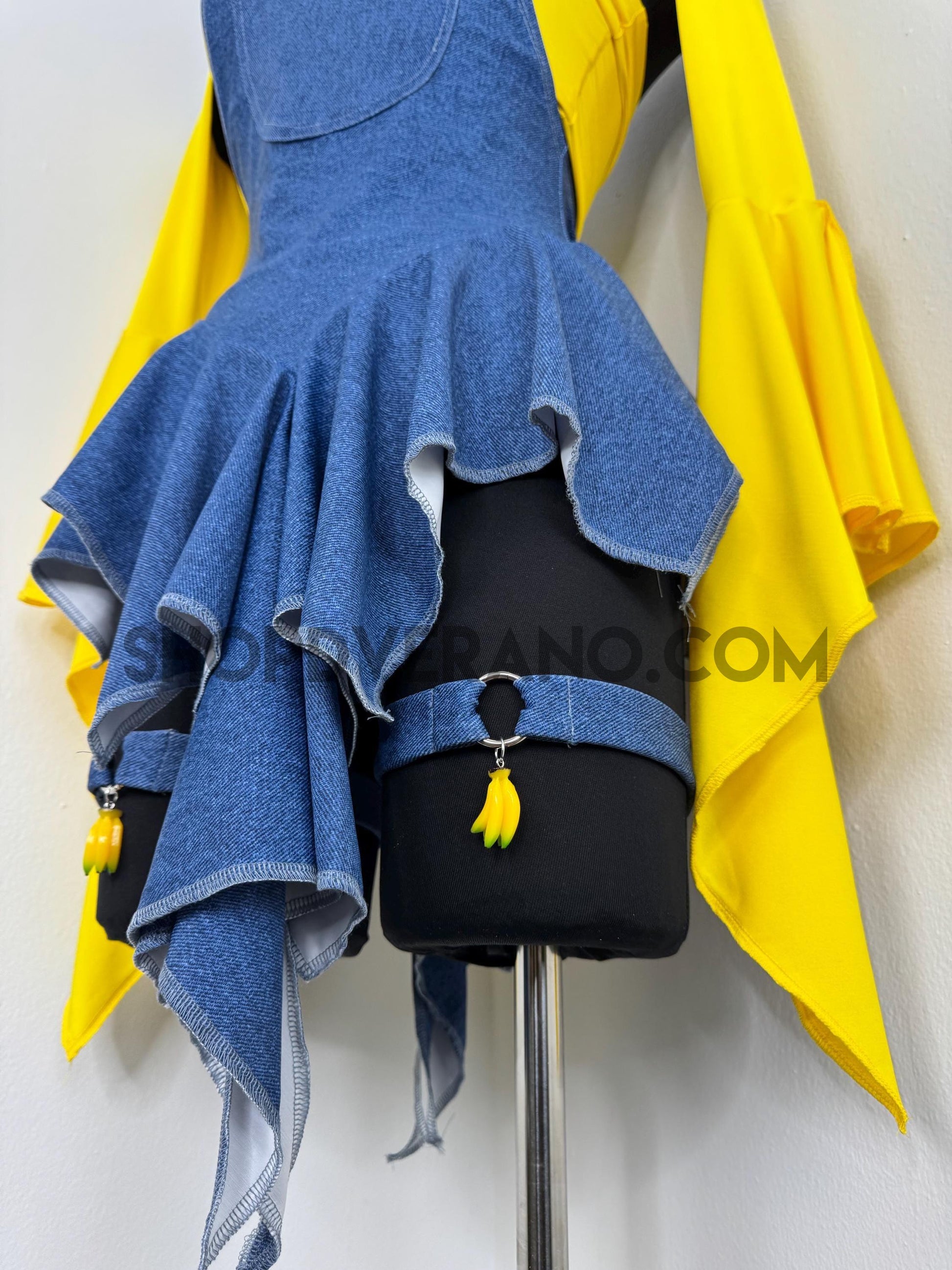 Designed in vibrant sunshine yellow and denim inspired blue, the Bananas Fairy Set features a high contrast color story that instantly pops. The bandeau top includes 1” interior elastic support for a secure, comfortable fit, allowing you to move freely while dancing, exploring, or causing a little harmless chaos. Crafted from premium 4-way stretch fabrics, this set hugs the body while remaining breathable and flexible for all day wear.