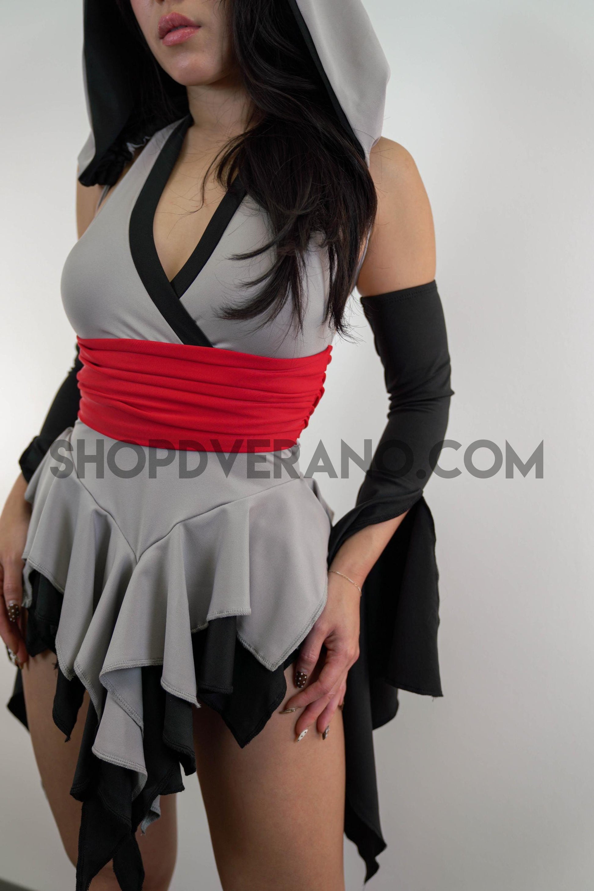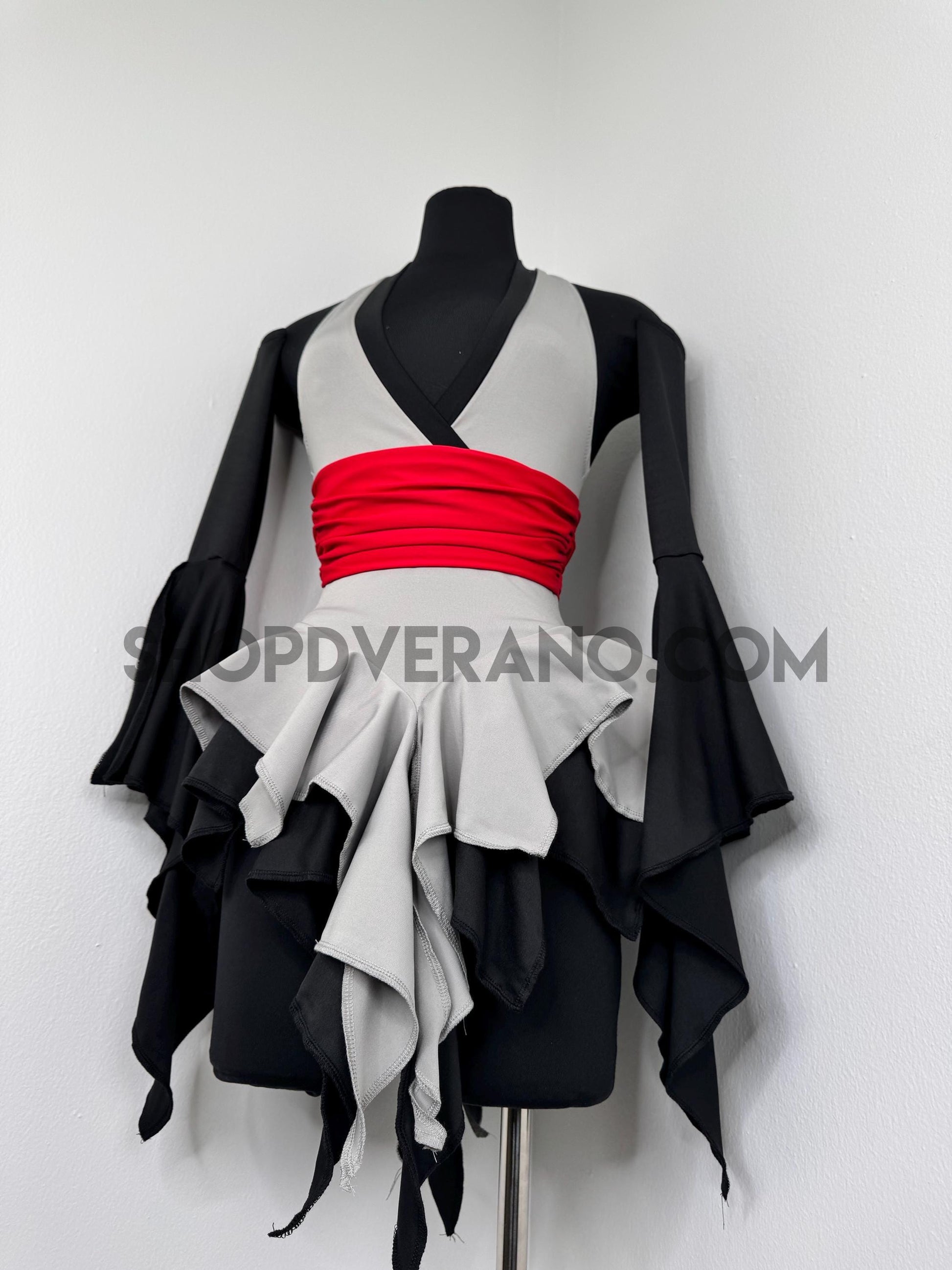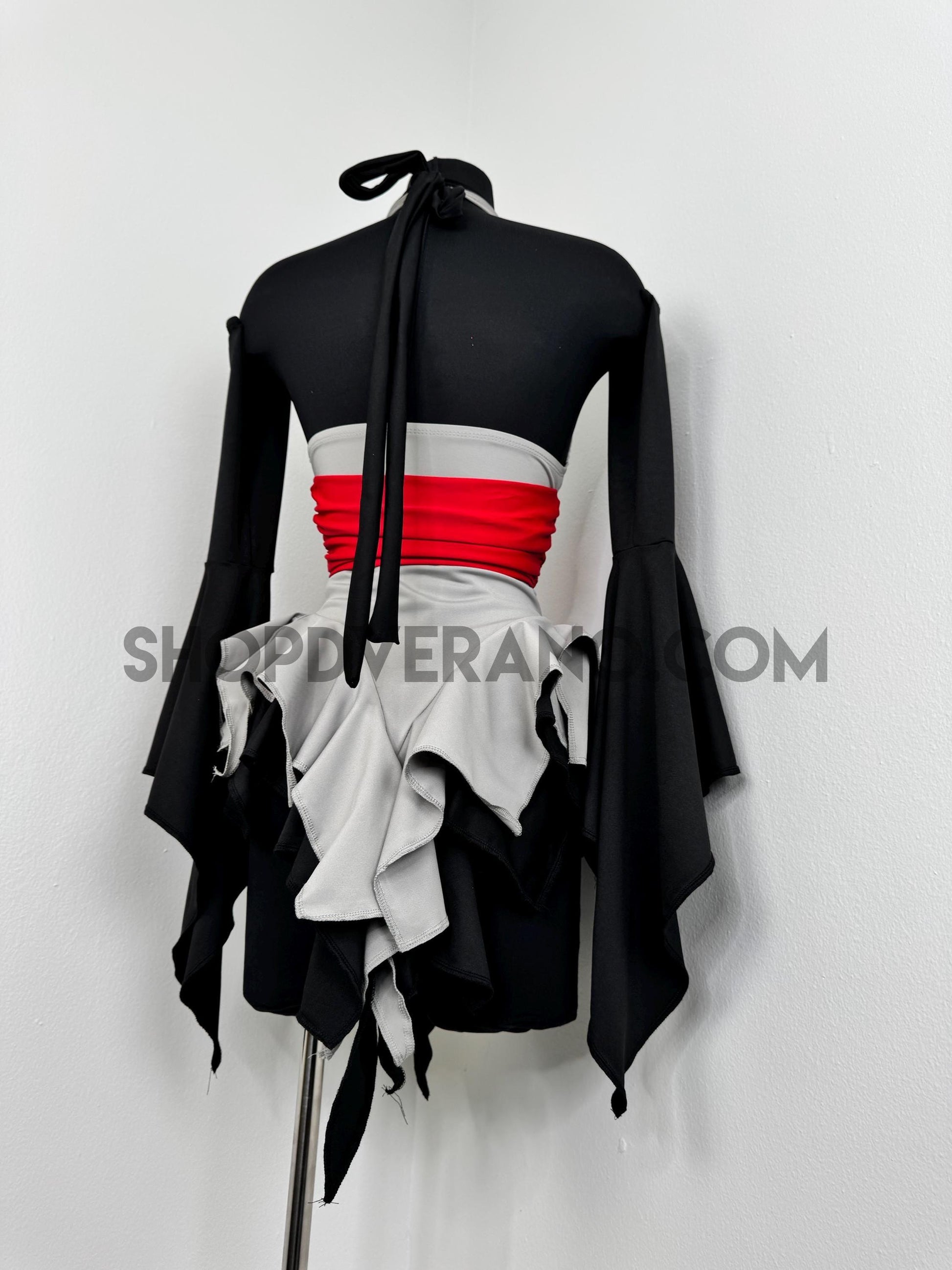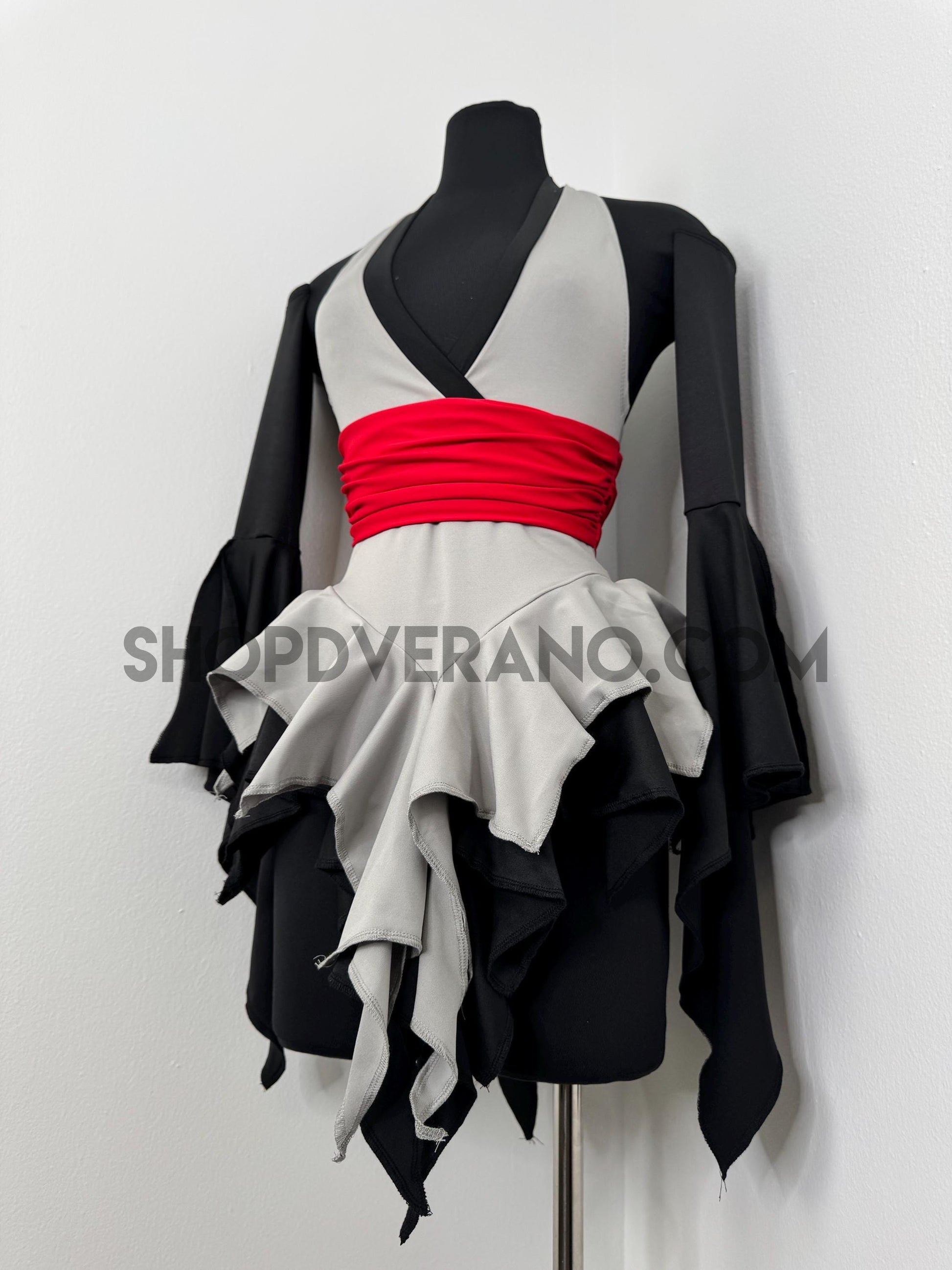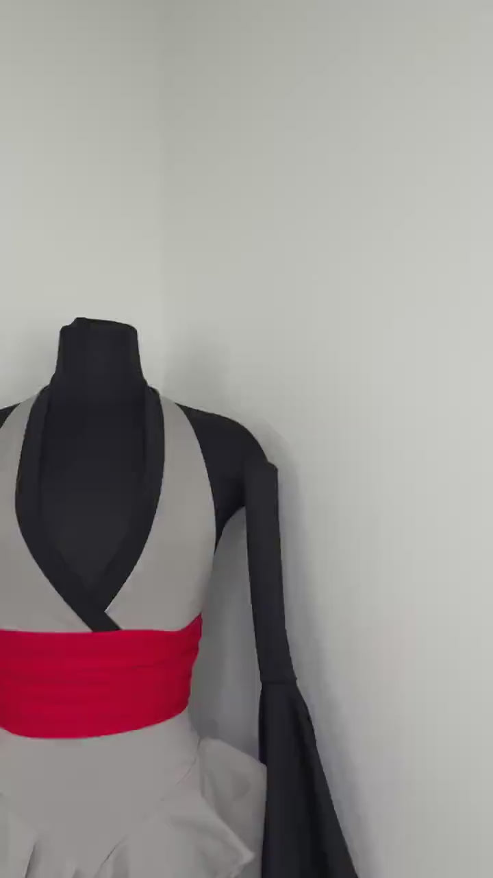 The V-cut crossed halter bodice creates a flattering, secure fit, anchored by a built in red obi-style belt detail that cinches the waist and sharpens the silhouette. This striking red accent symbolizes focused power, intensity, and controlled energy; bringing balance and edge to the design. Layered fairy skirt panels are designed to elongate the body and naturally sculpt the waist, fluttering with intention as you move. While the sleeved add the perfect finishing touch.