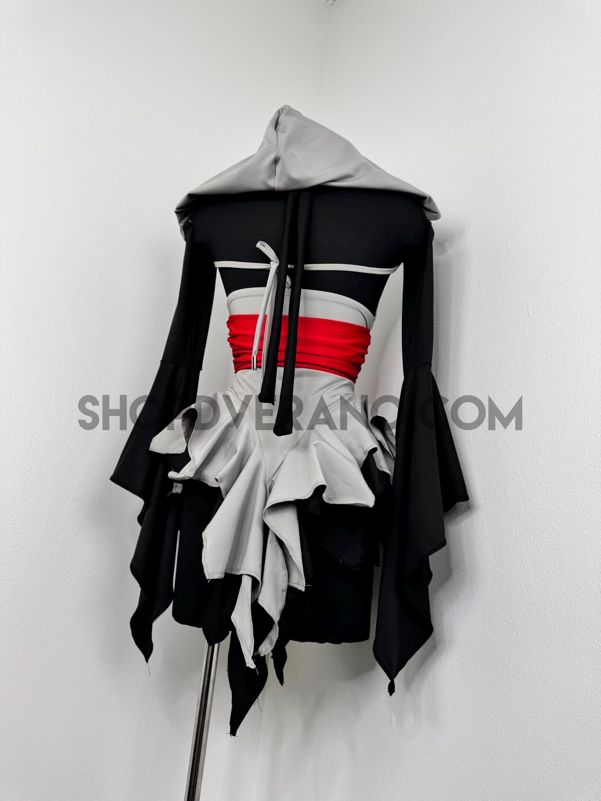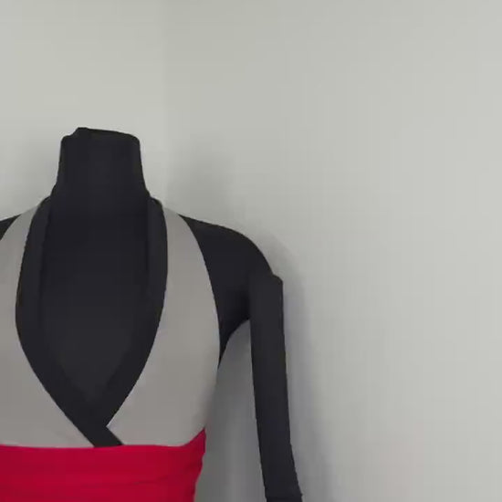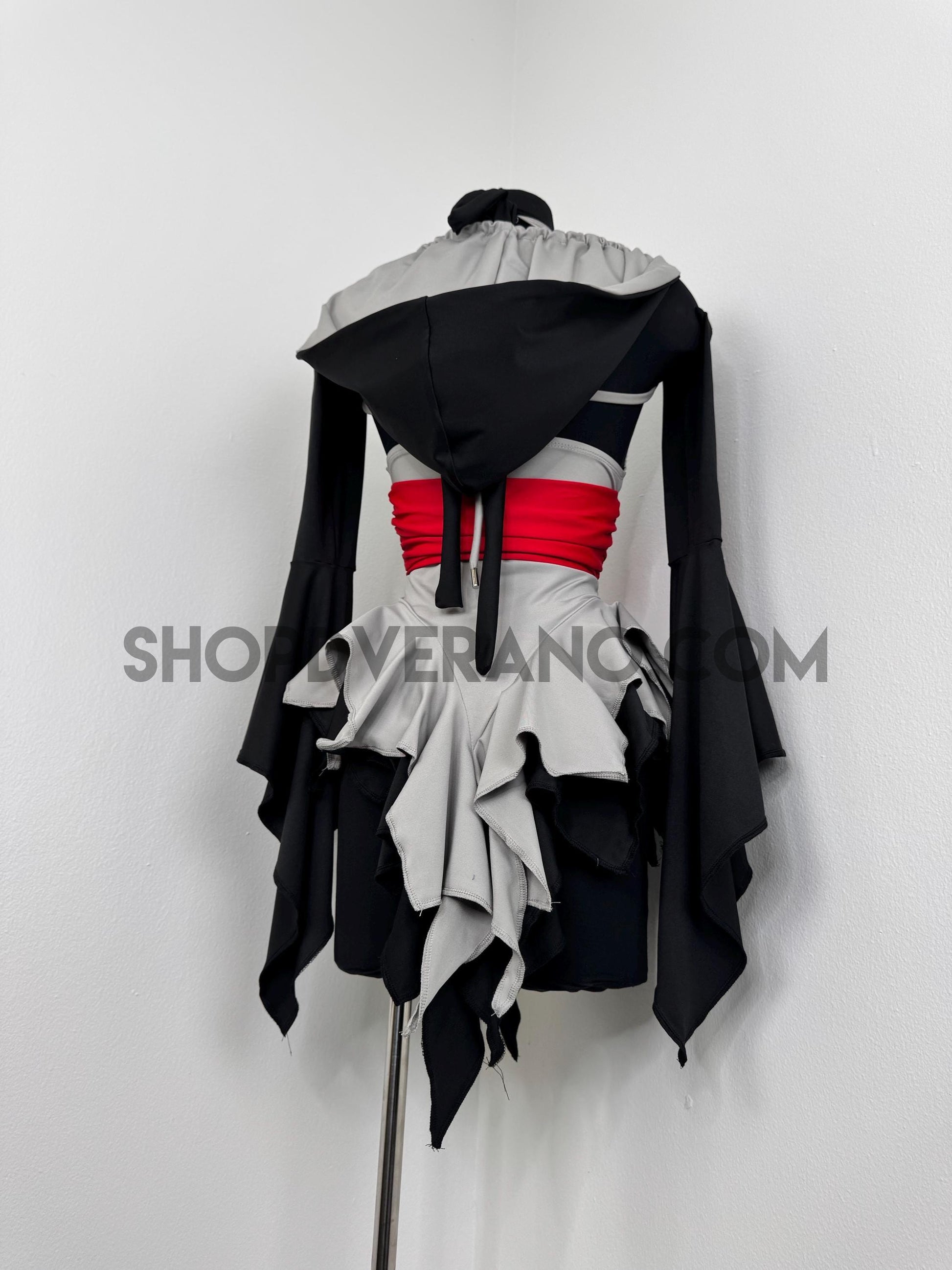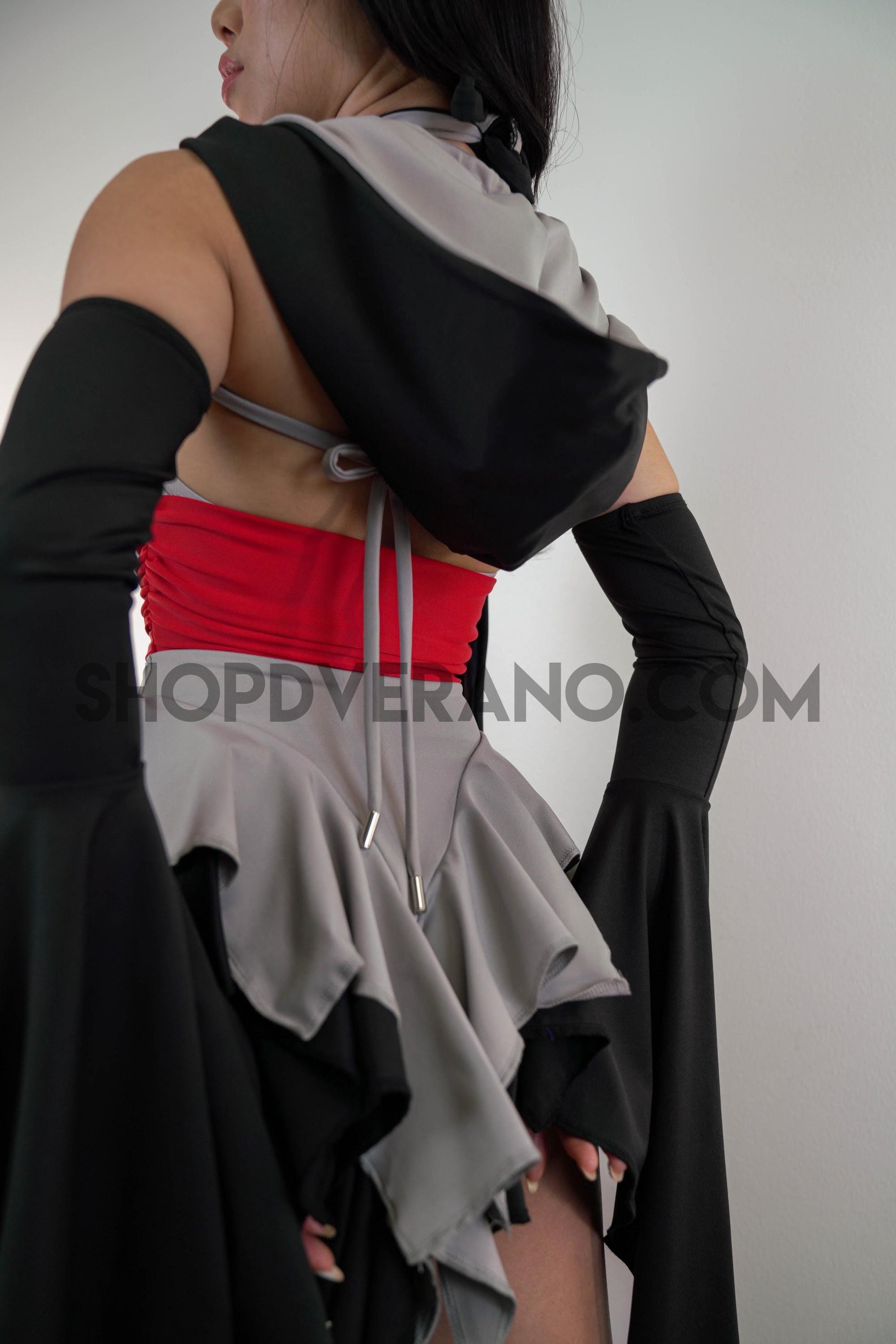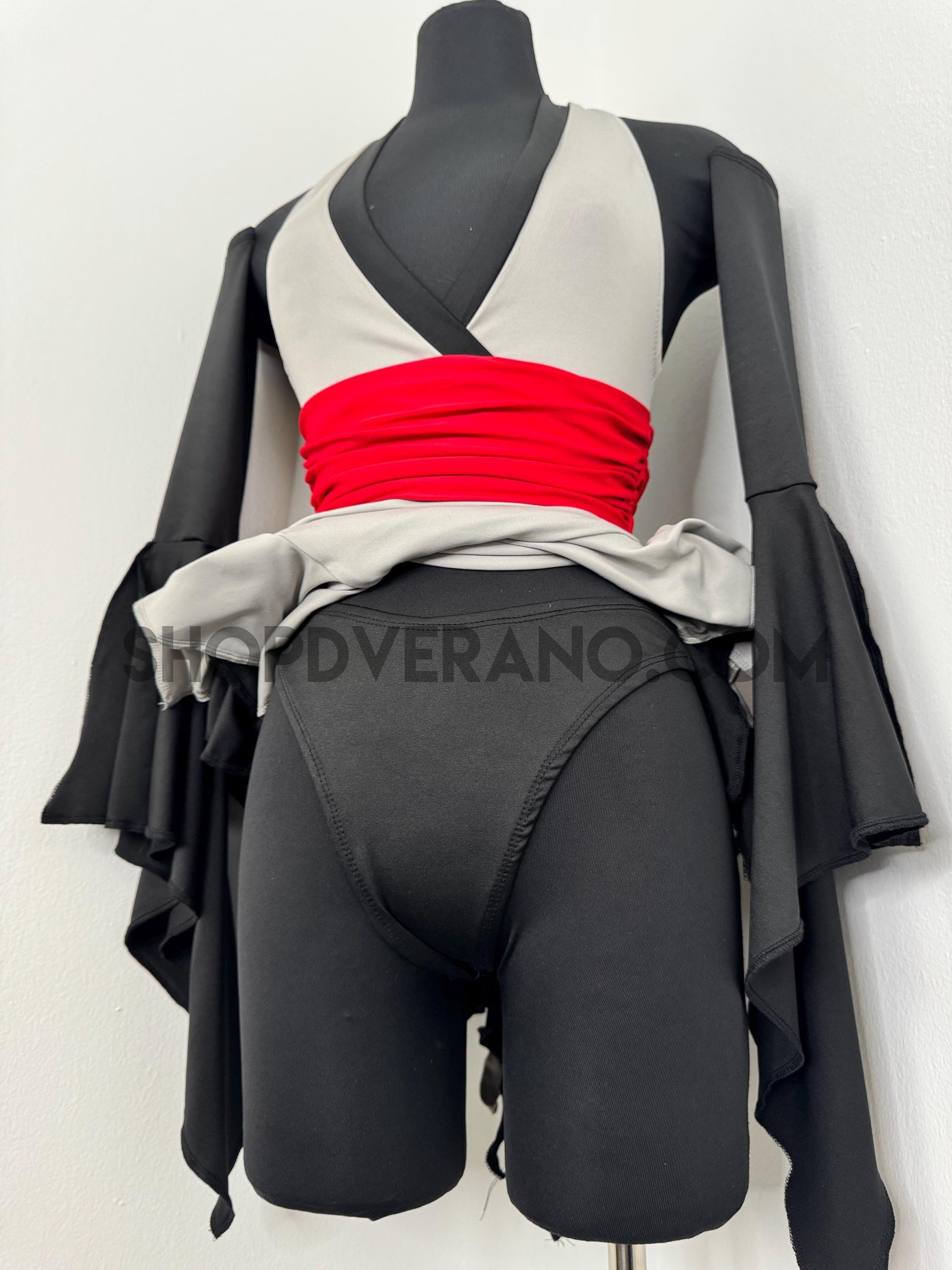 The V-cut crossed halter bodice creates a flattering, secure fit, anchored by a built in red obi-style belt detail that cinches the waist and sharpens the silhouette. This striking red accent symbolizes focused power, intensity, and controlled energy; bringing balance and edge to the design. Layered fairy skirt panels are designed to elongate the body and naturally sculpt the waist, fluttering with intention as you move. While the sleeved add the perfect finishing touch.