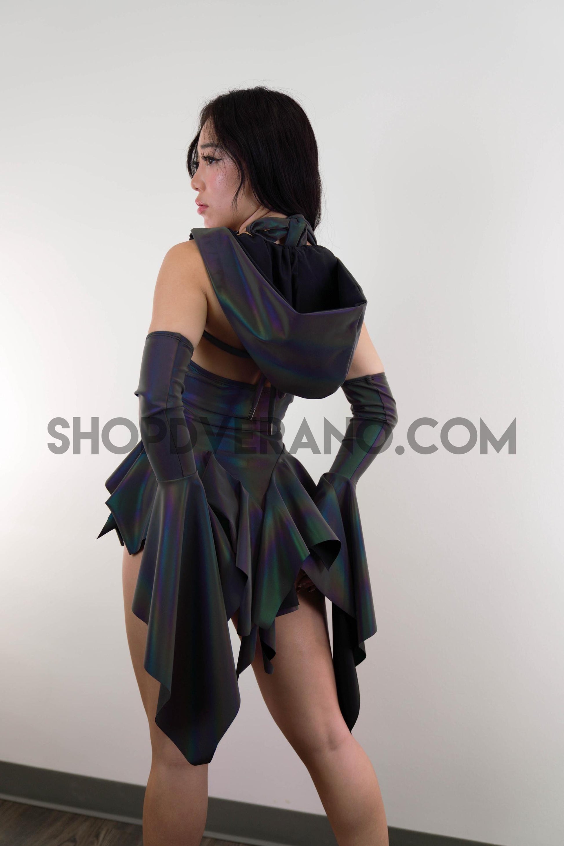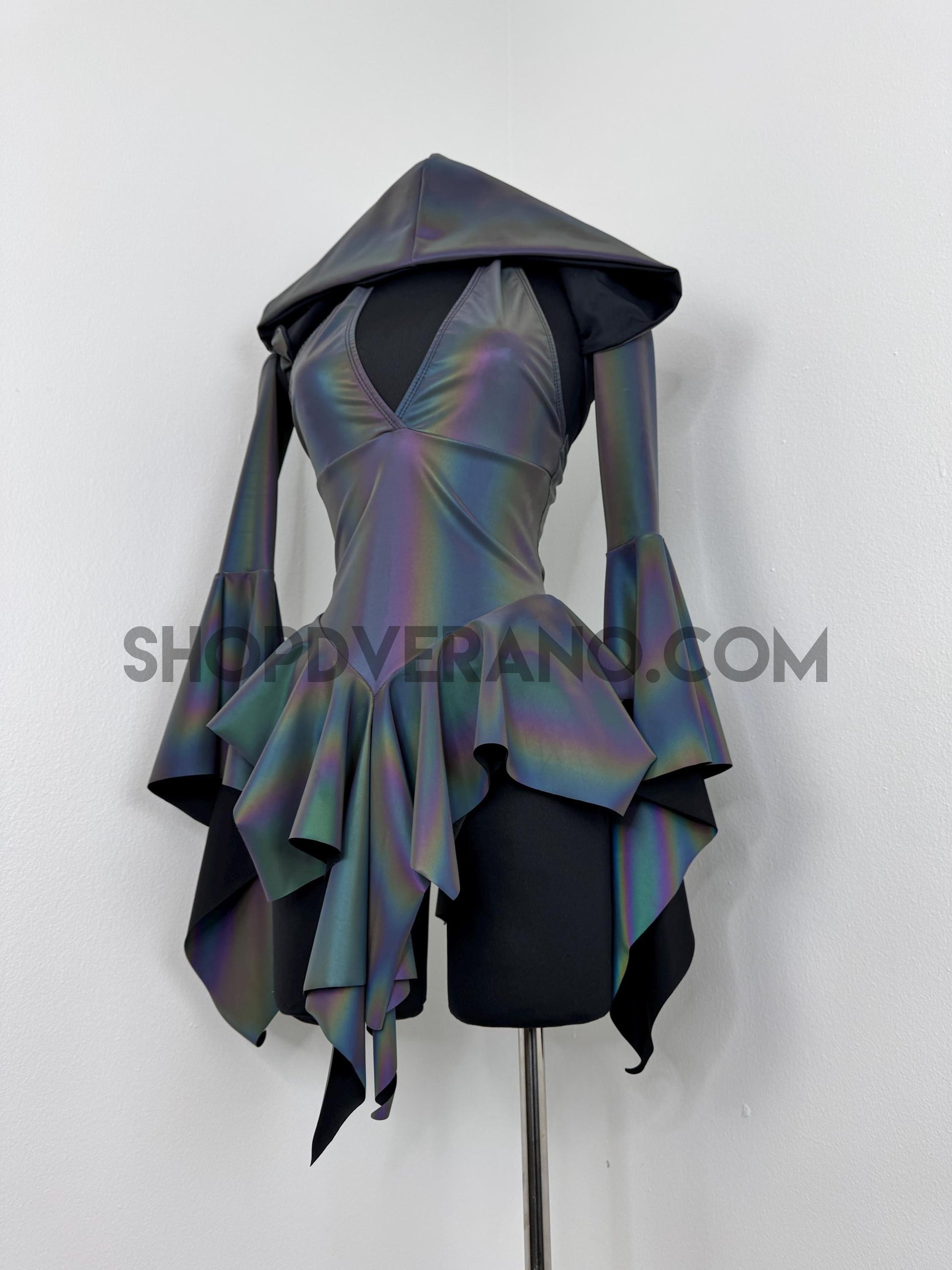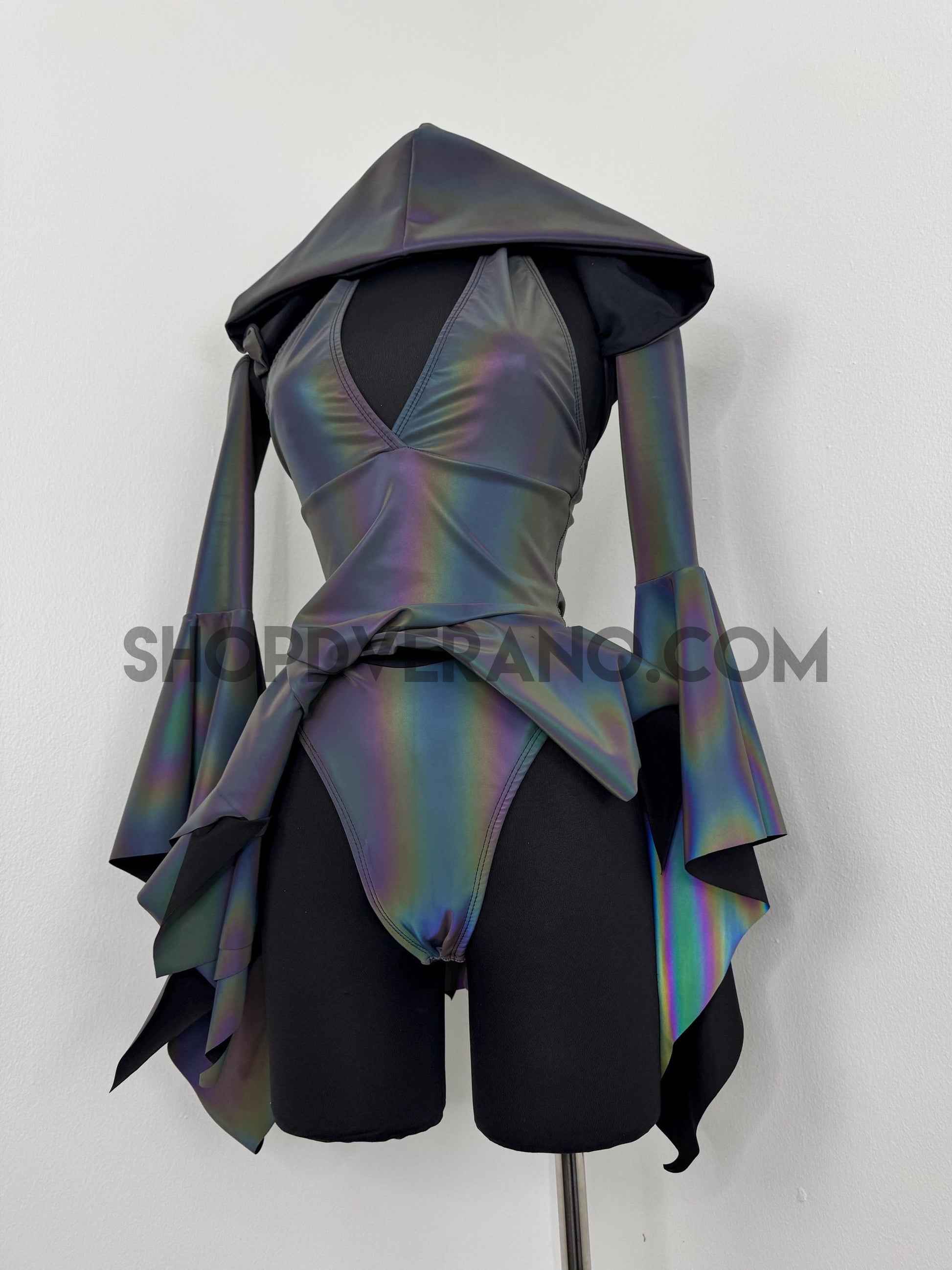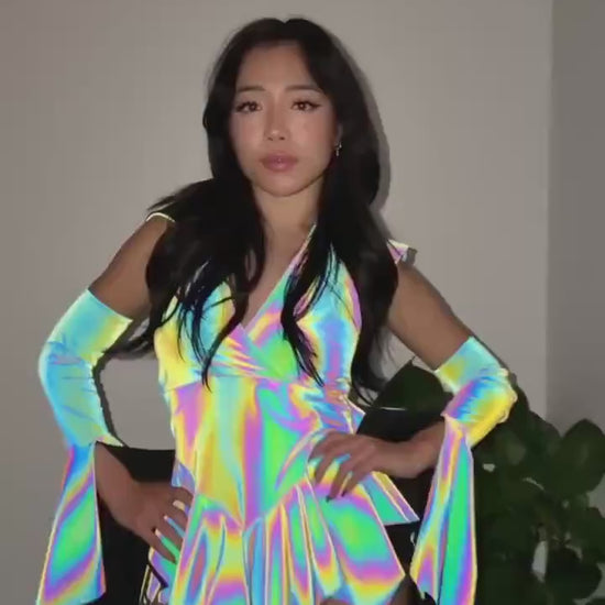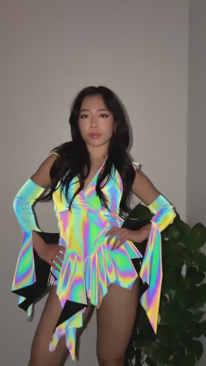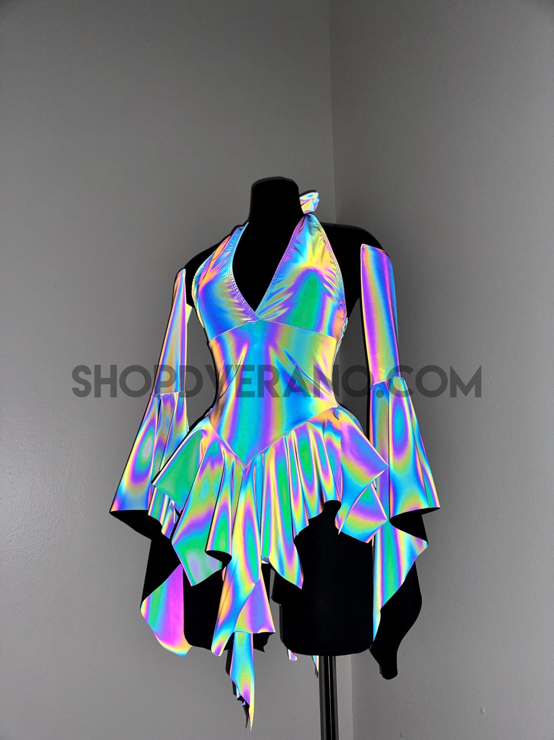 Crafted from flash reactive rainbow fabric, Prismatica transforms depending on the lighting. In natural or low light, the fabric appears softer and more muted; under flash, or harsh direct light, it ignites into a vivid, oil-slick rainbow glow that looks unreal on camera and on the dance floor.
