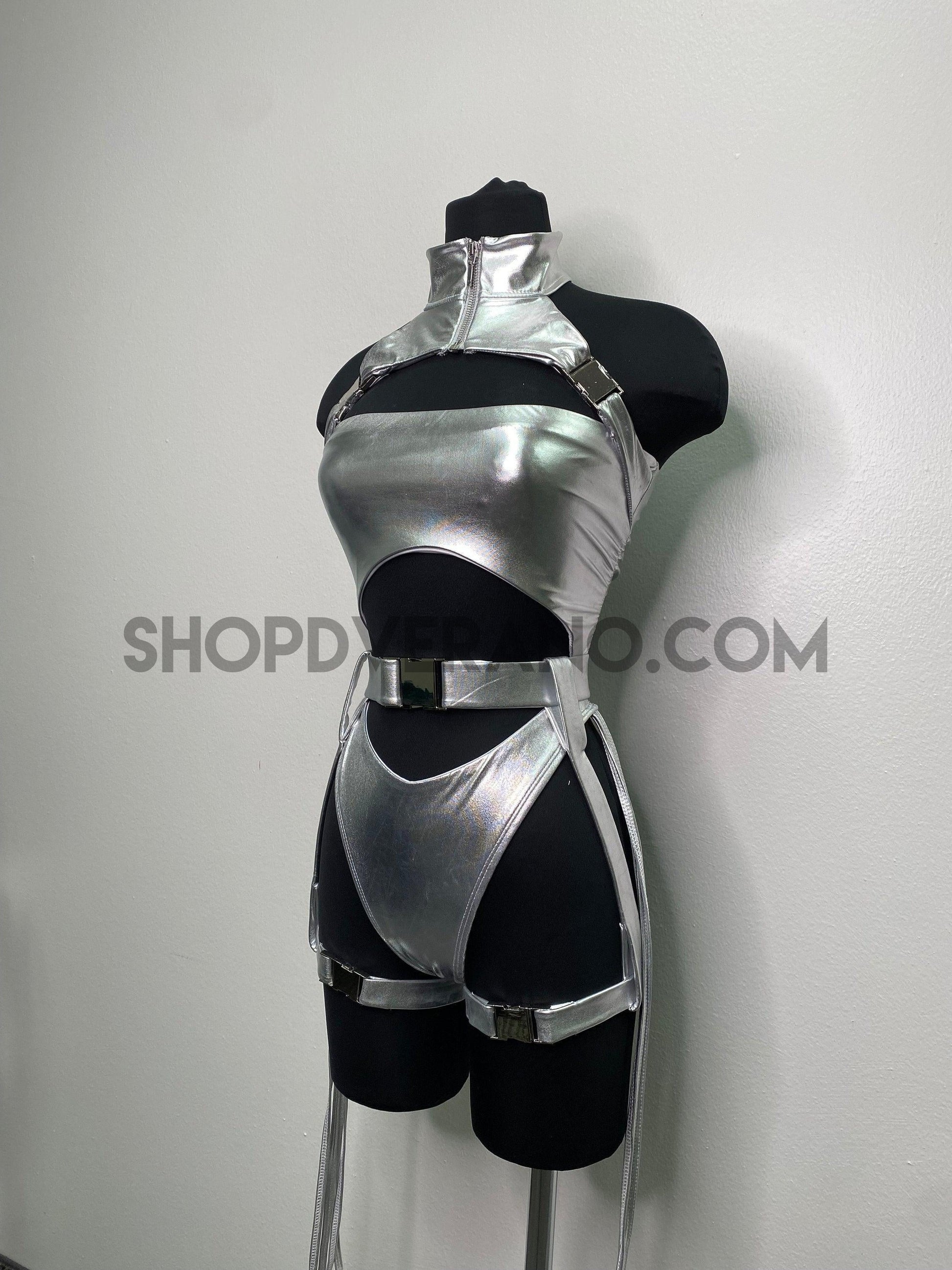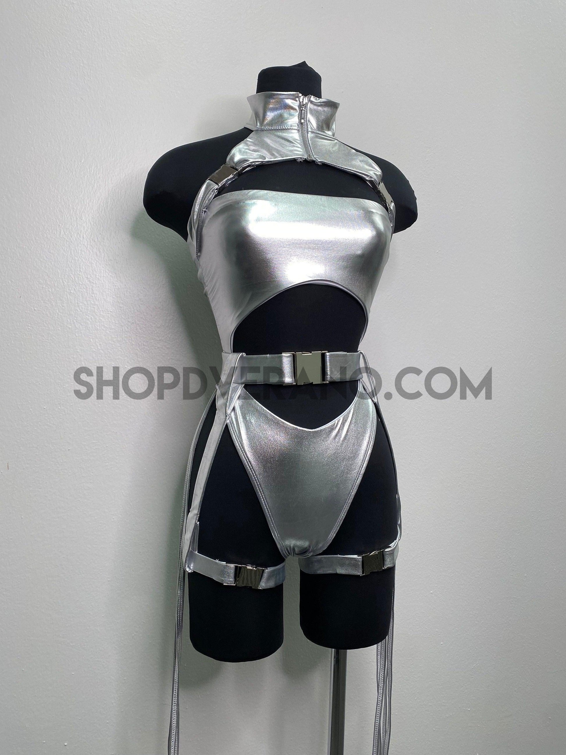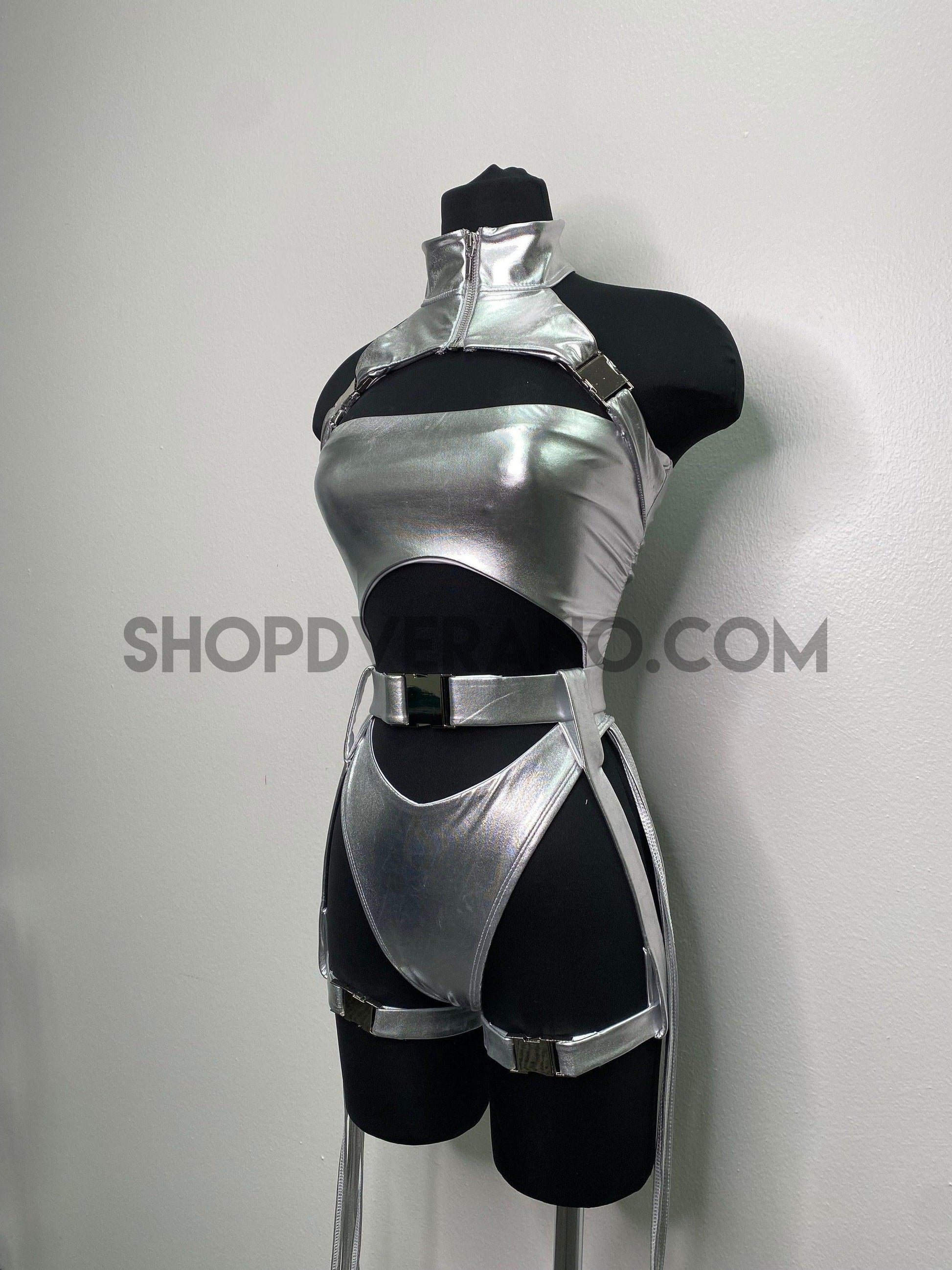 Disfraz de rave, atuendo de rave, mono plateado, traje de baño plateado, atuendo de festival, mono de rave, ropa de rave, hebillas de traje de baño de rave