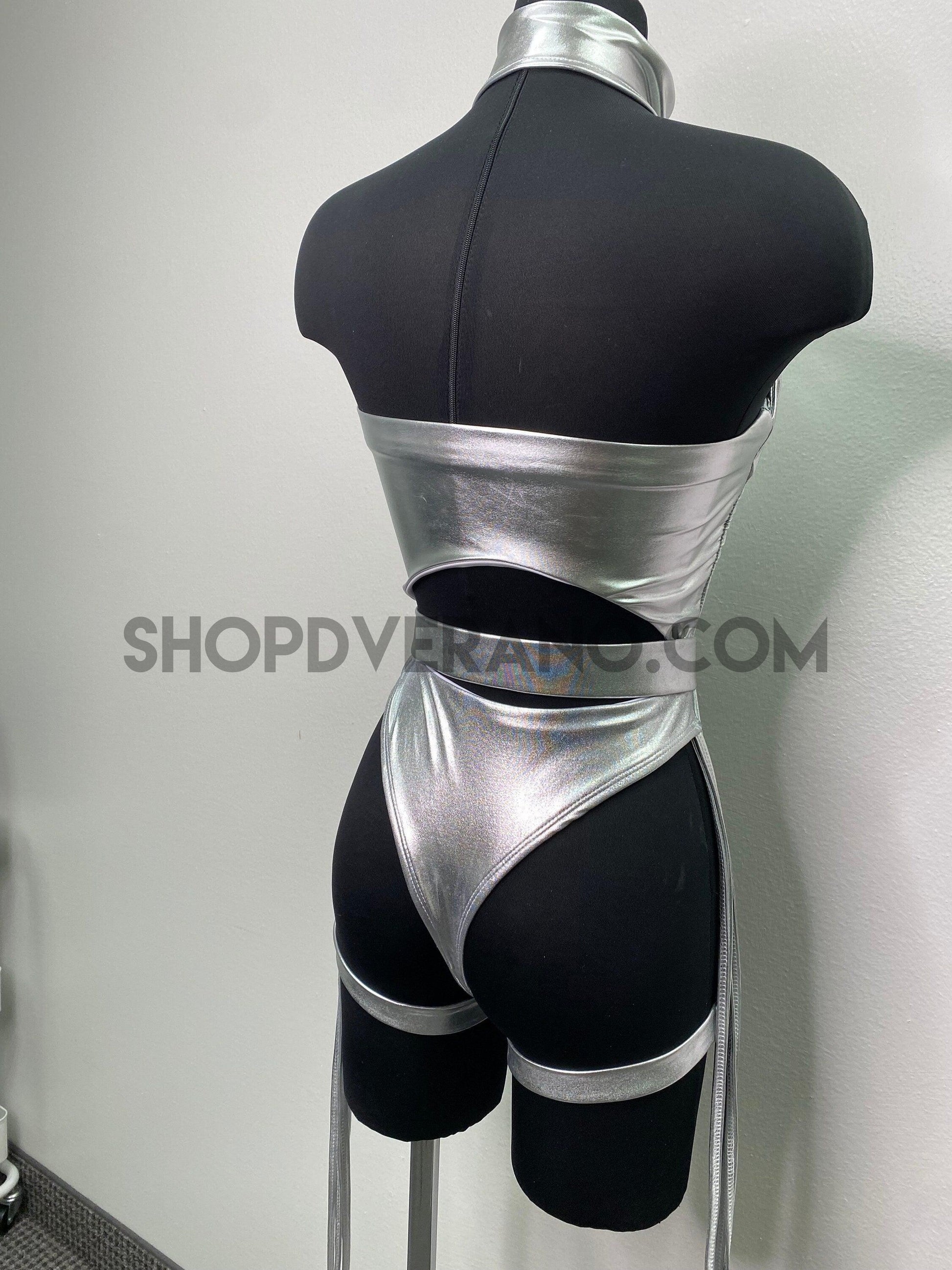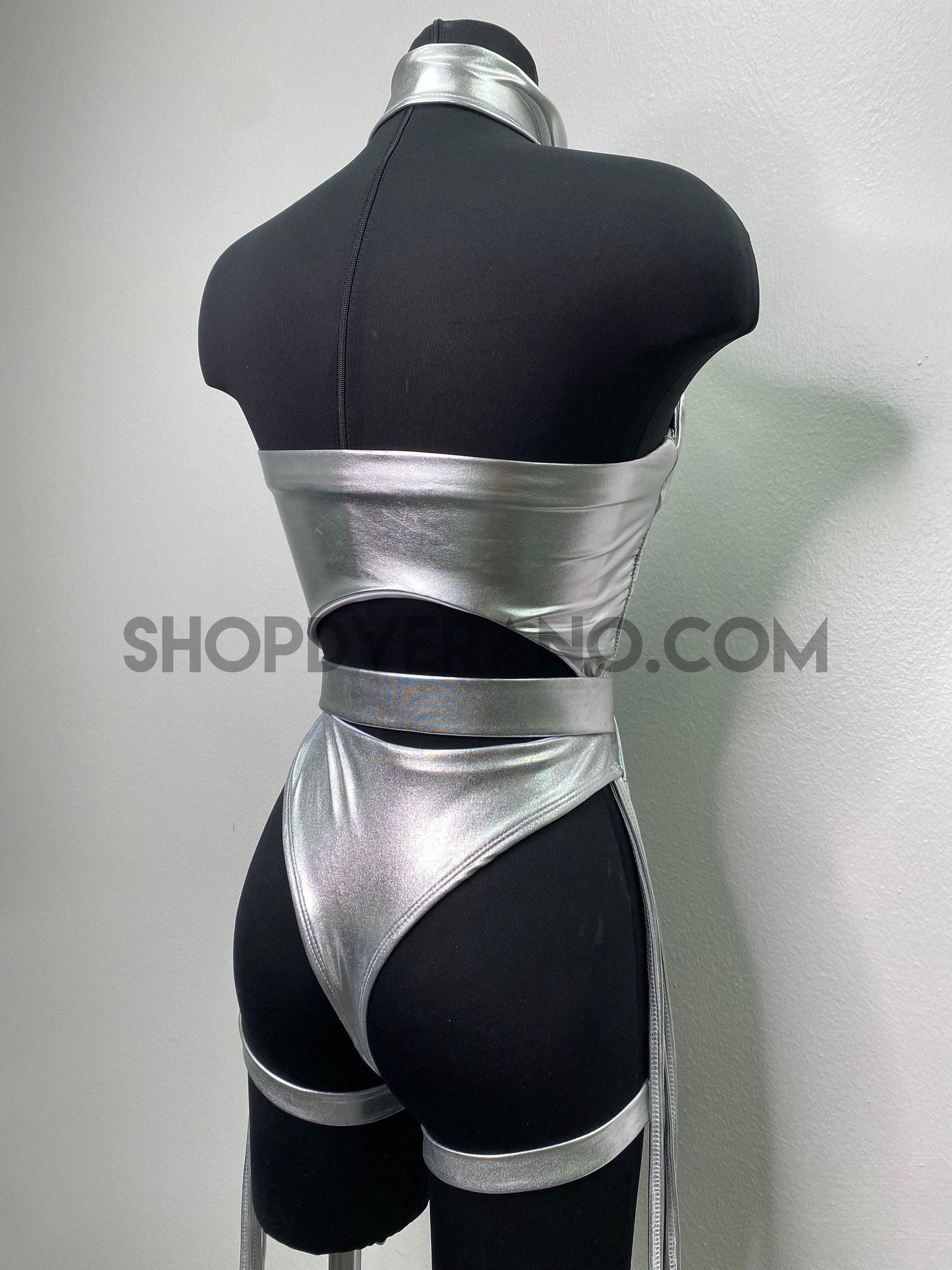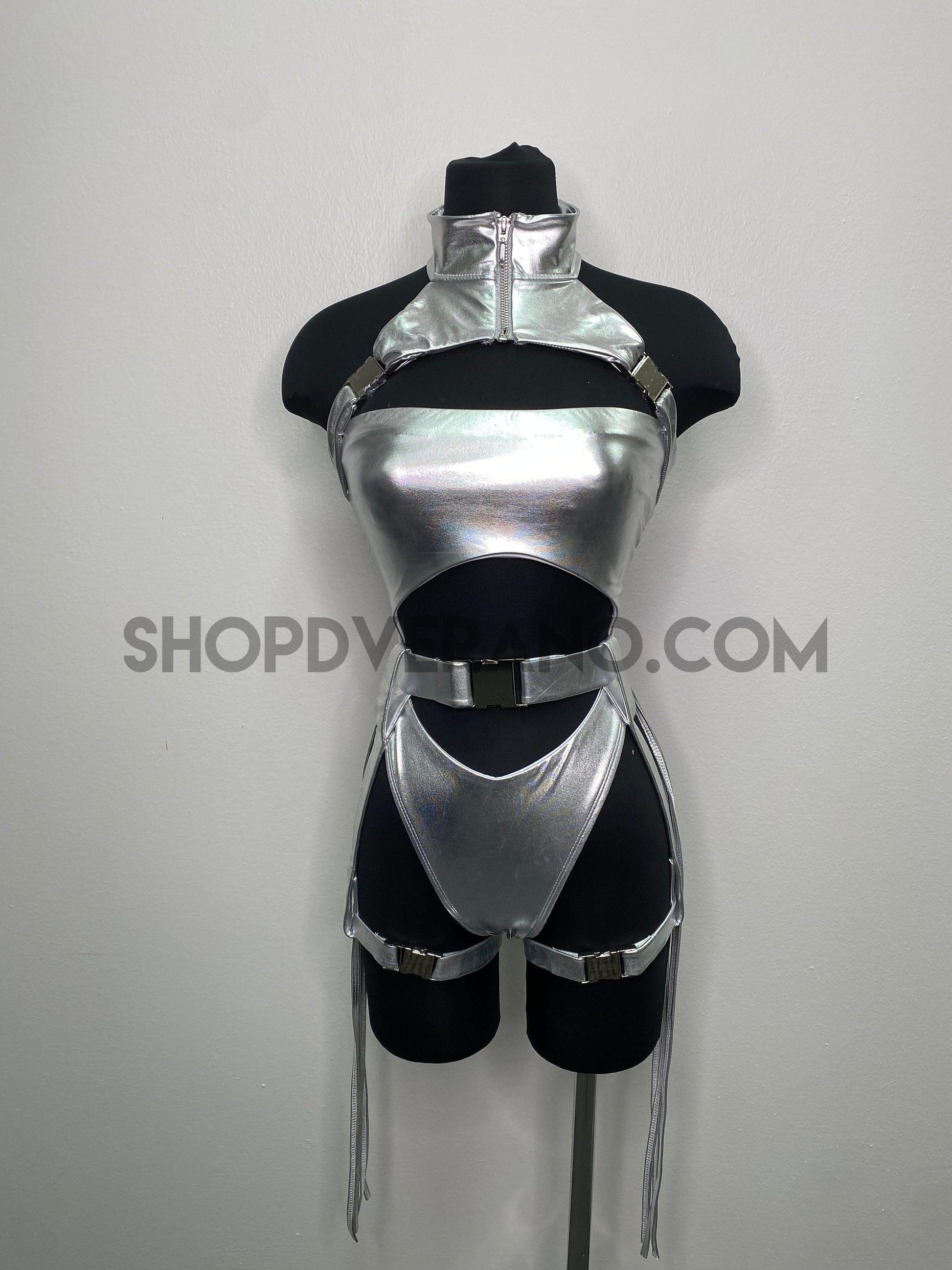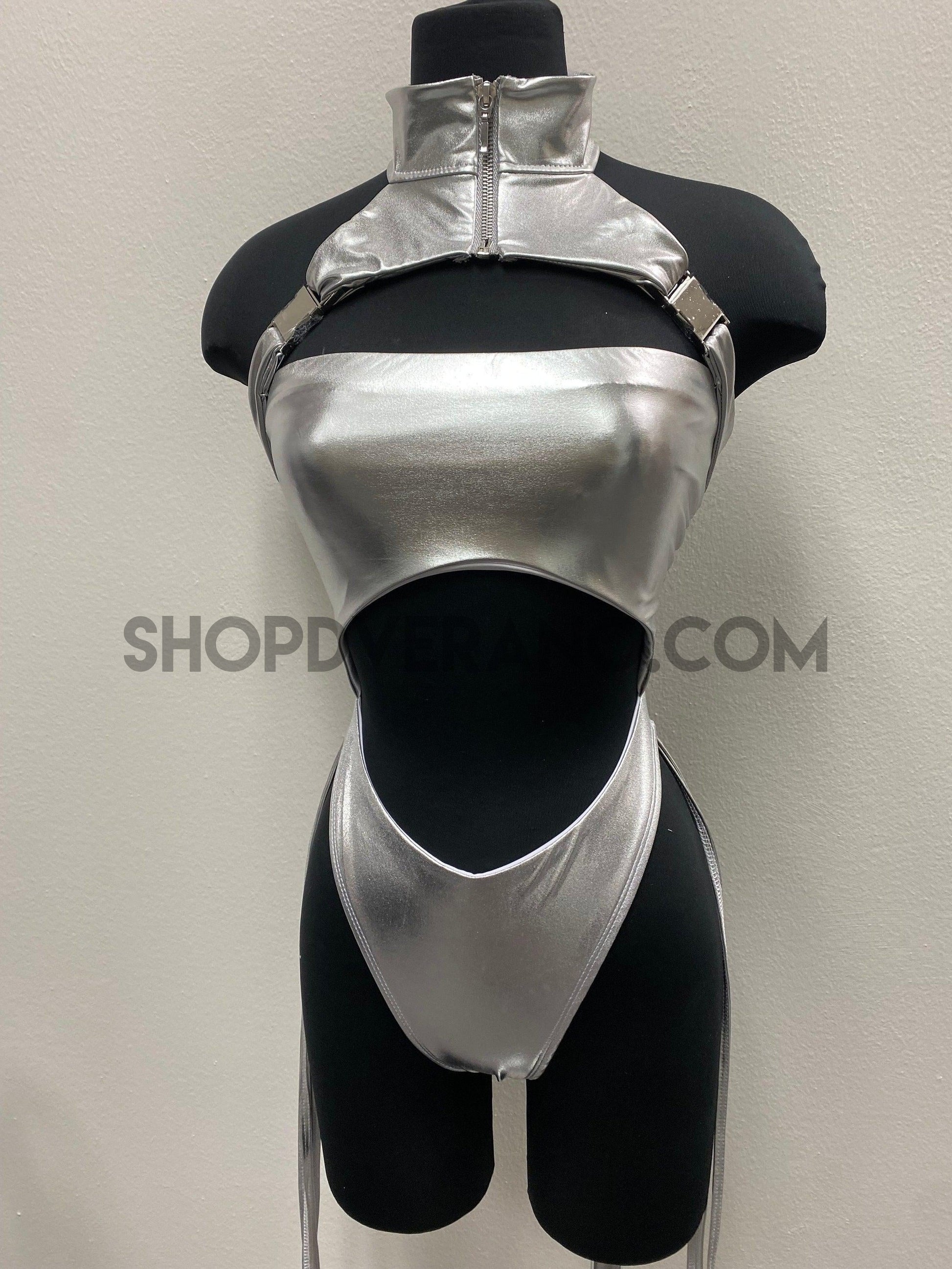 Disfraz de rave, atuendo de rave, mono plateado, traje de baño plateado, atuendo de festival, mono de rave, ropa de rave, hebillas de traje de baño de rave