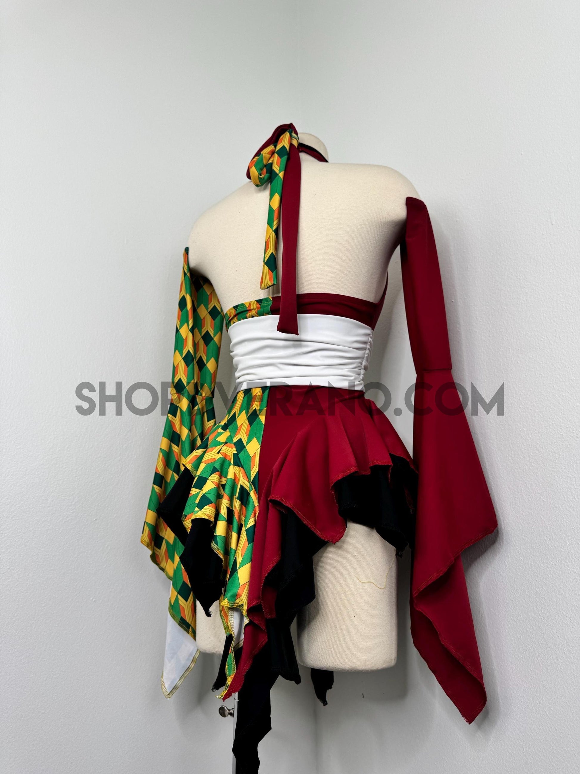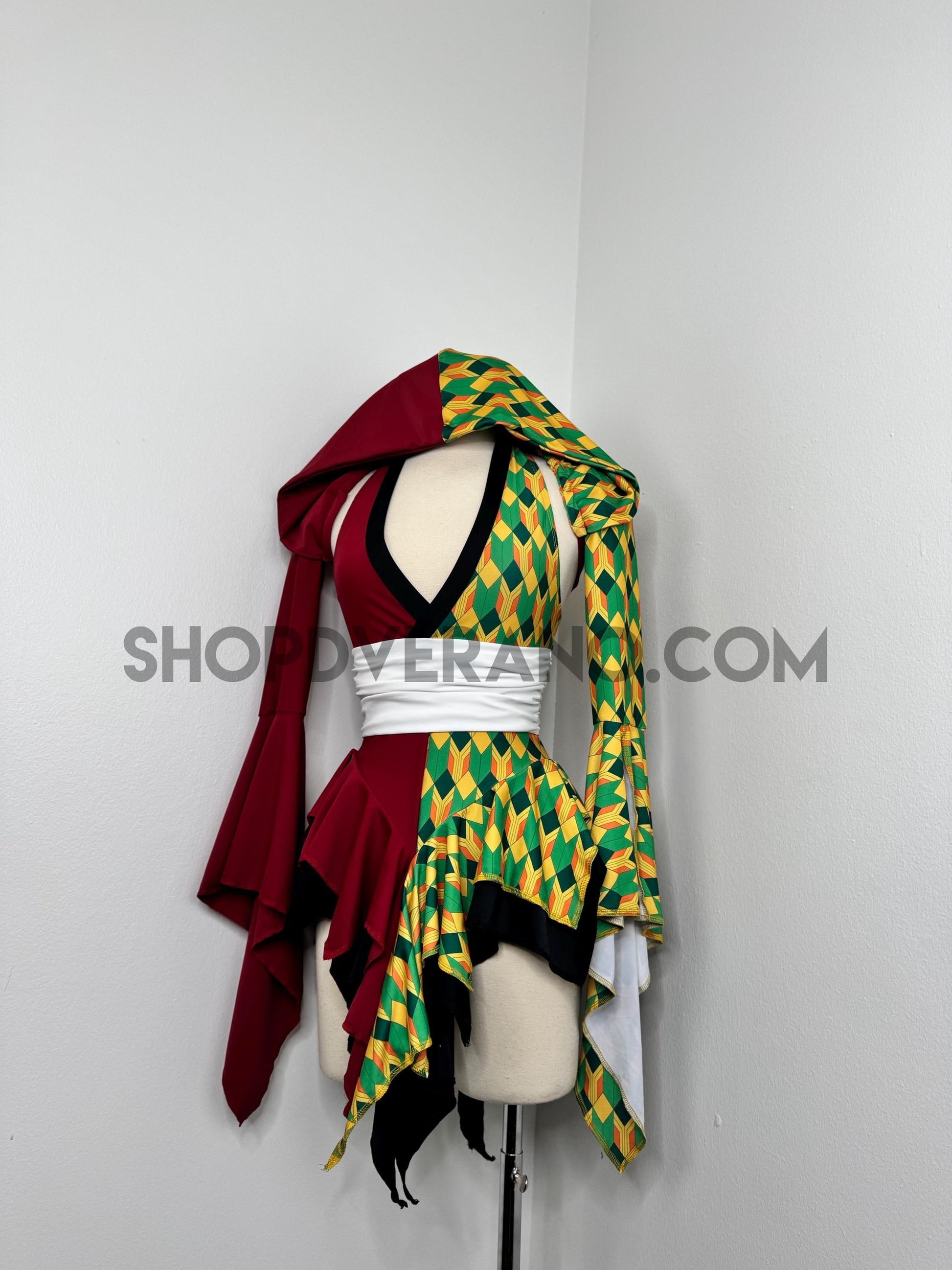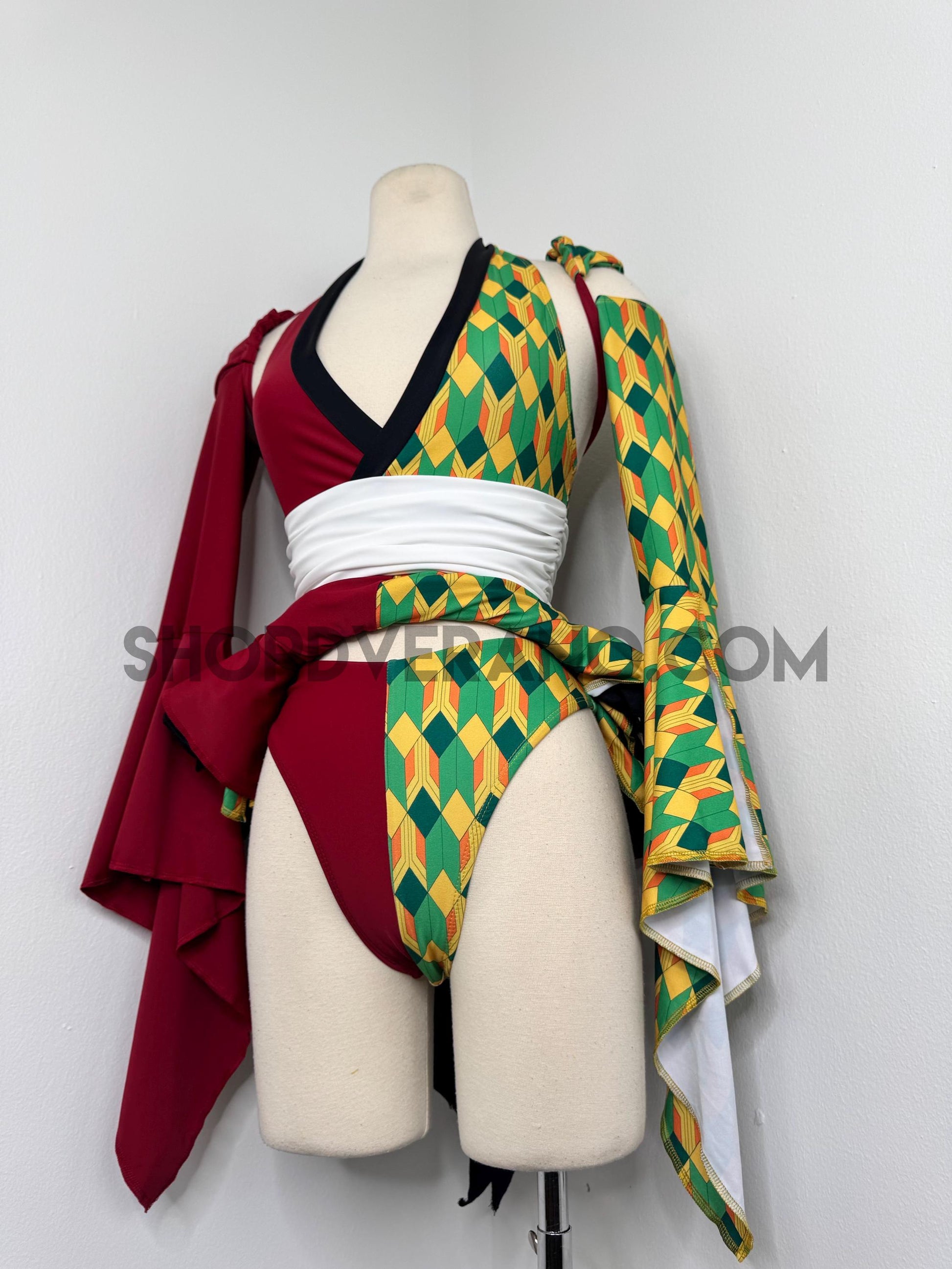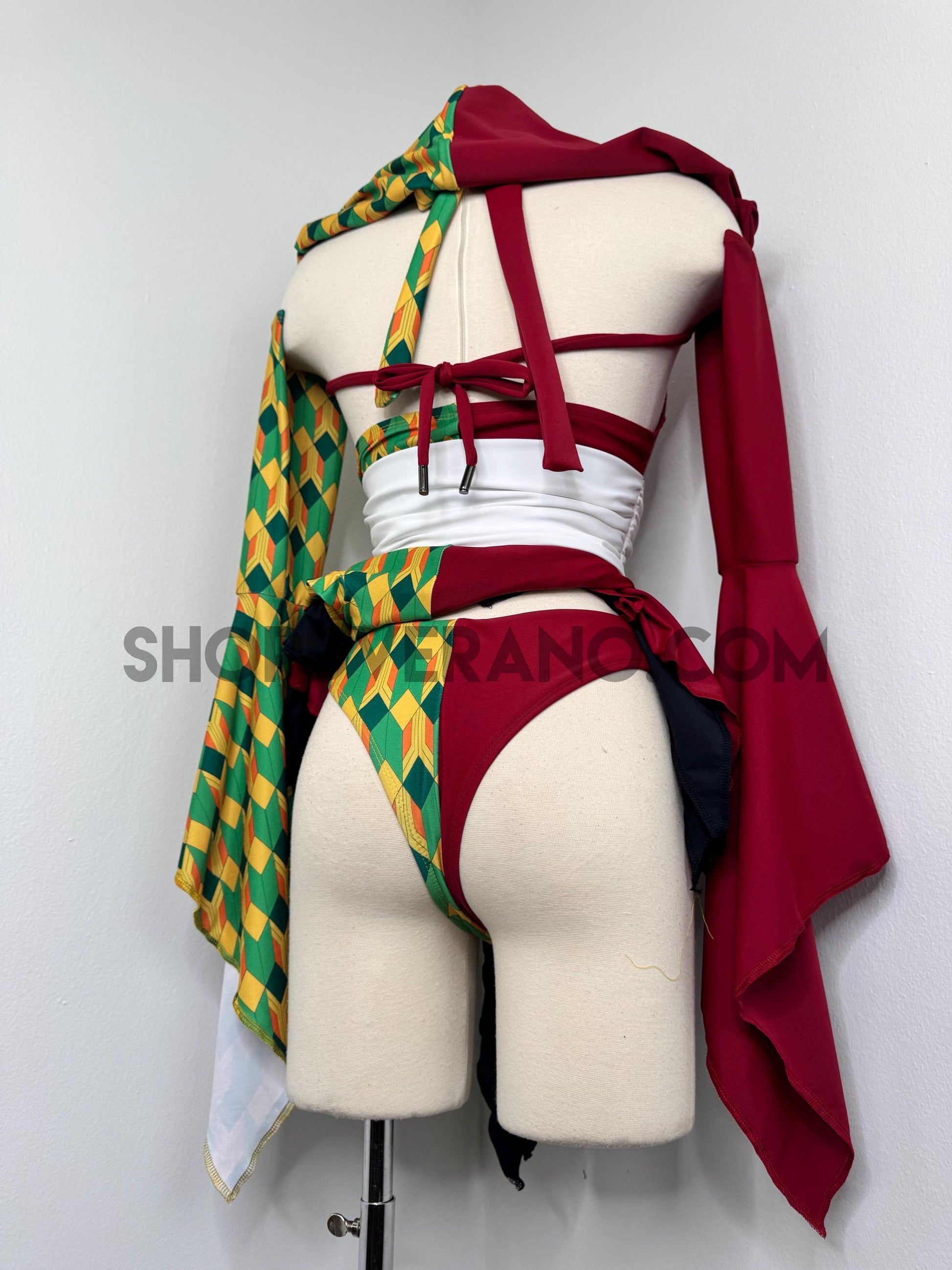 Designed with a bold asymmetrical color story, the Chilltide Fairy Set features a striking combination of half burgundy, and half emerald green & golden yellow geometric patterns, black accents, and a contrasting white waist wrap. The layered textures and contrasting panels create visual movement that reflects the balance between calm control and quiet power.