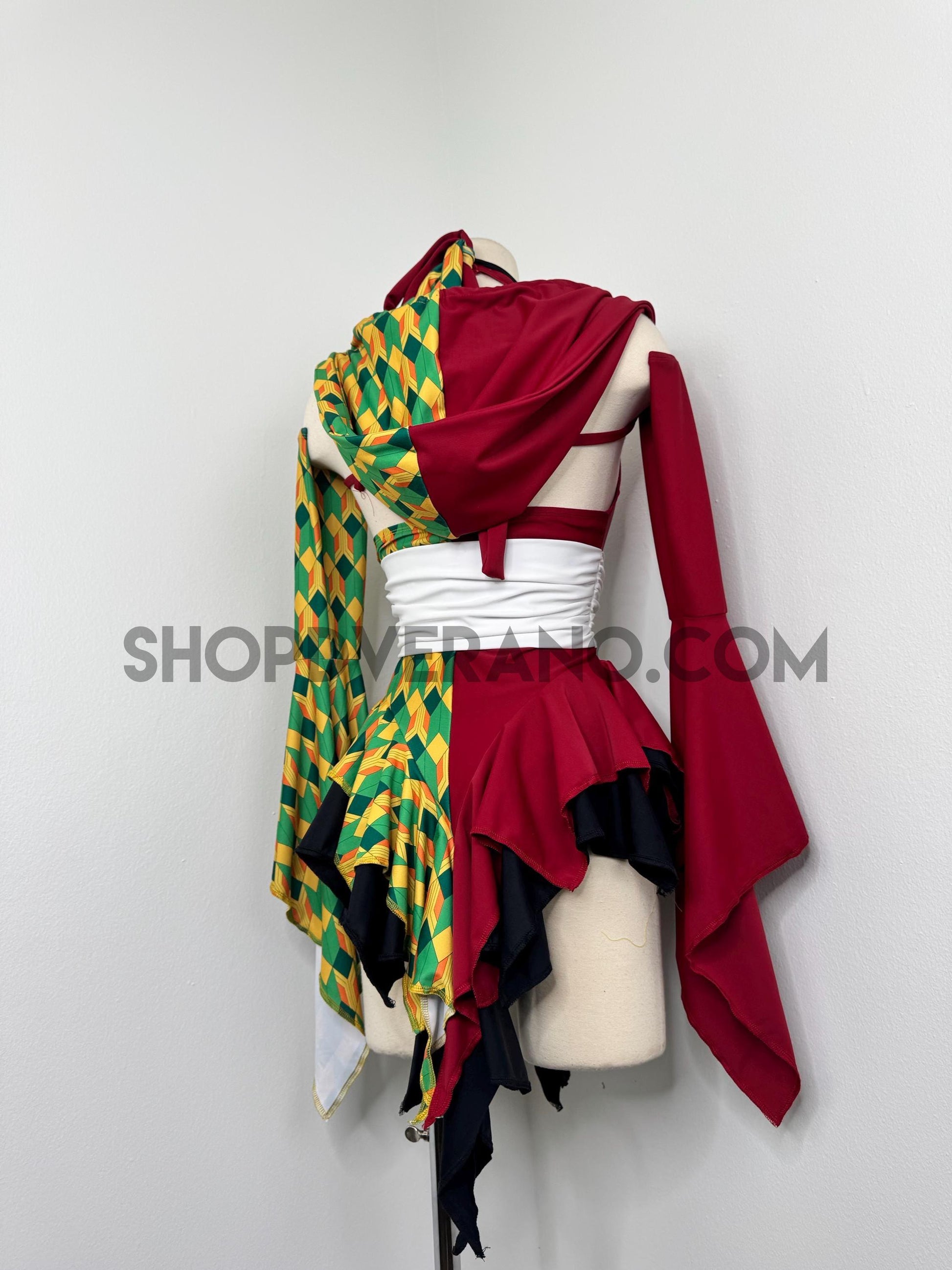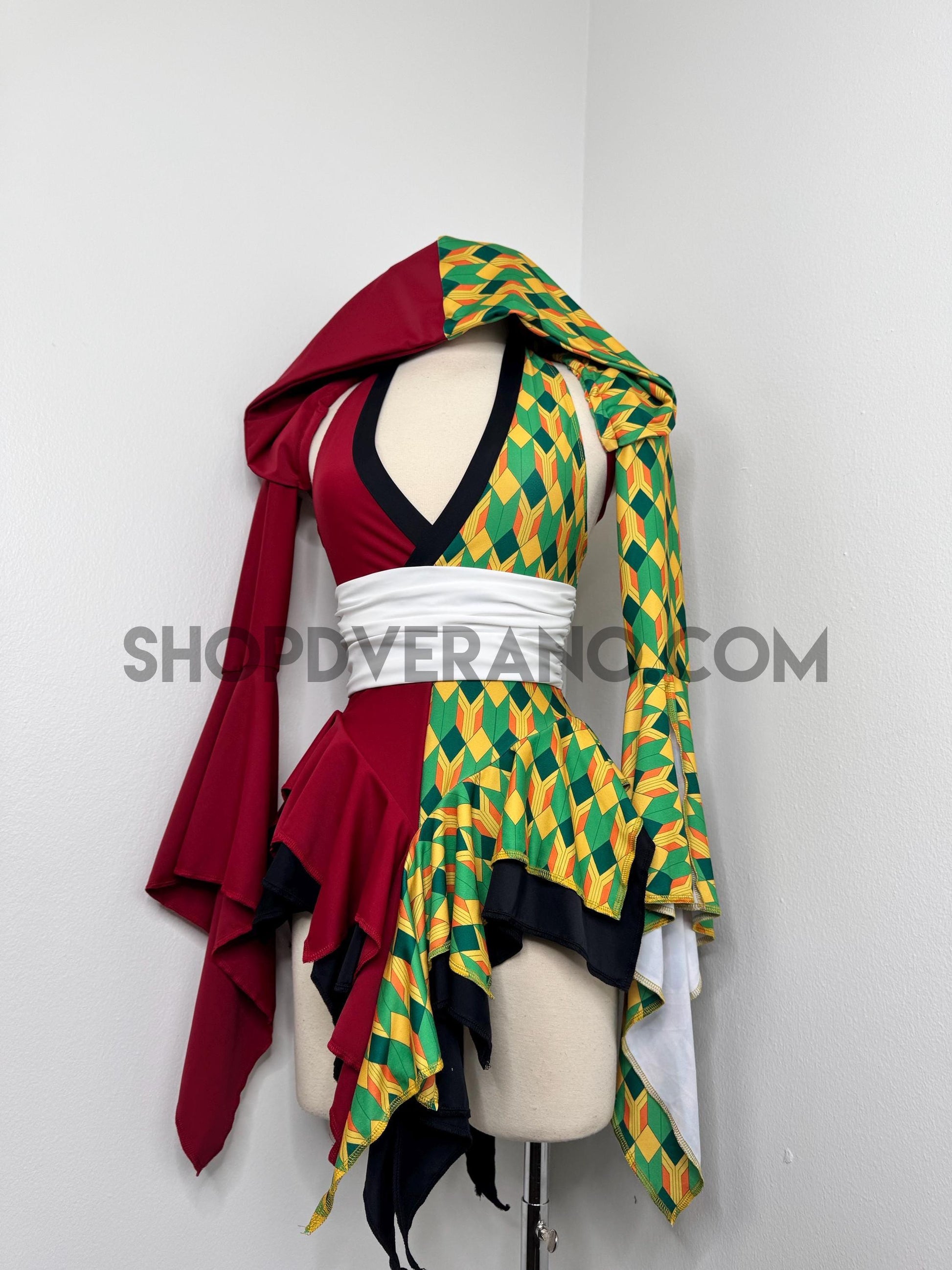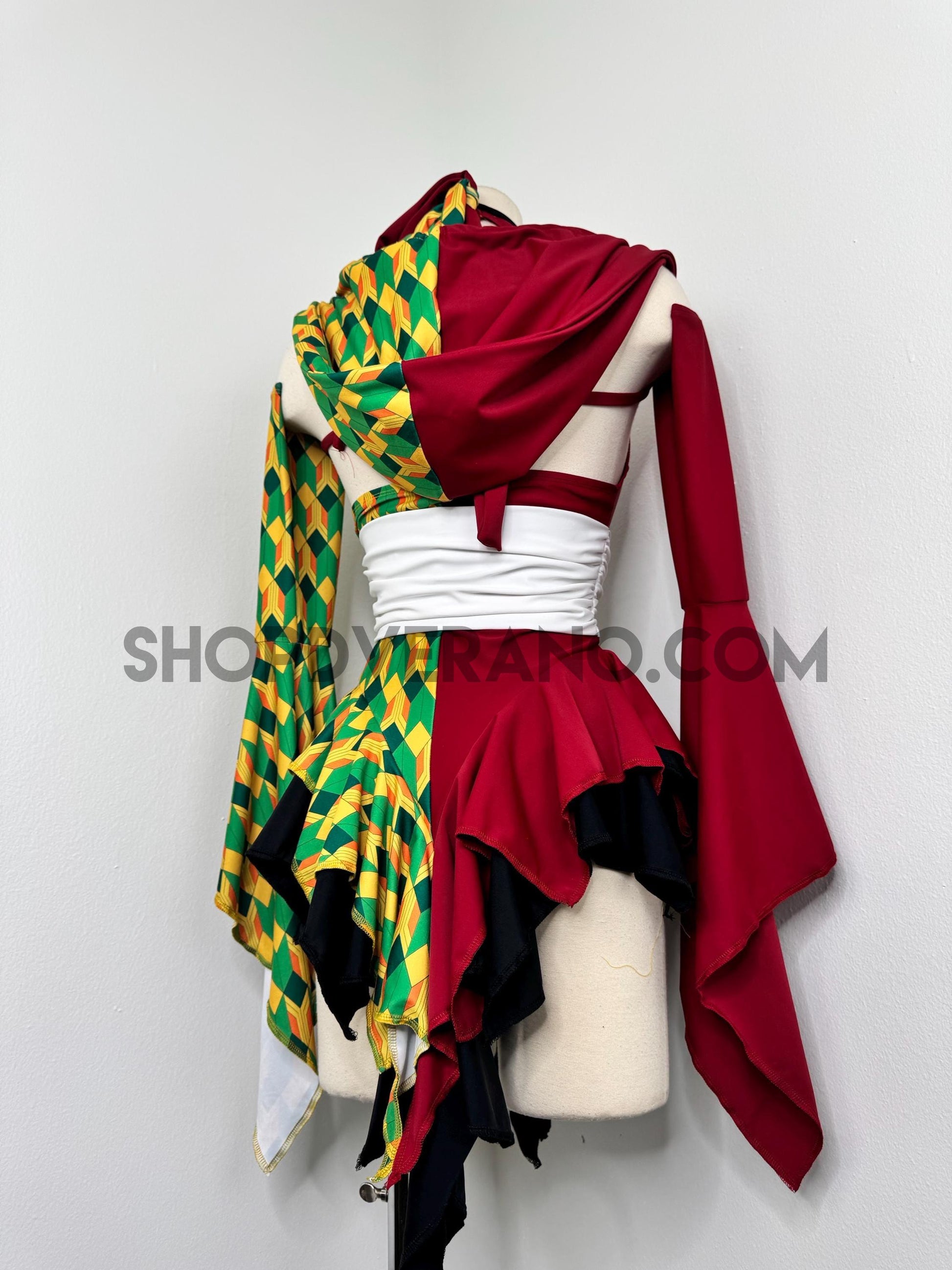 Designed with a bold asymmetrical color story, the Chilltide Fairy Set features a striking combination of half burgundy, and half emerald green & golden yellow geometric patterns, black accents, and a contrasting white waist wrap. The layered textures and contrasting panels create visual movement that reflects the balance between calm control and quiet power.