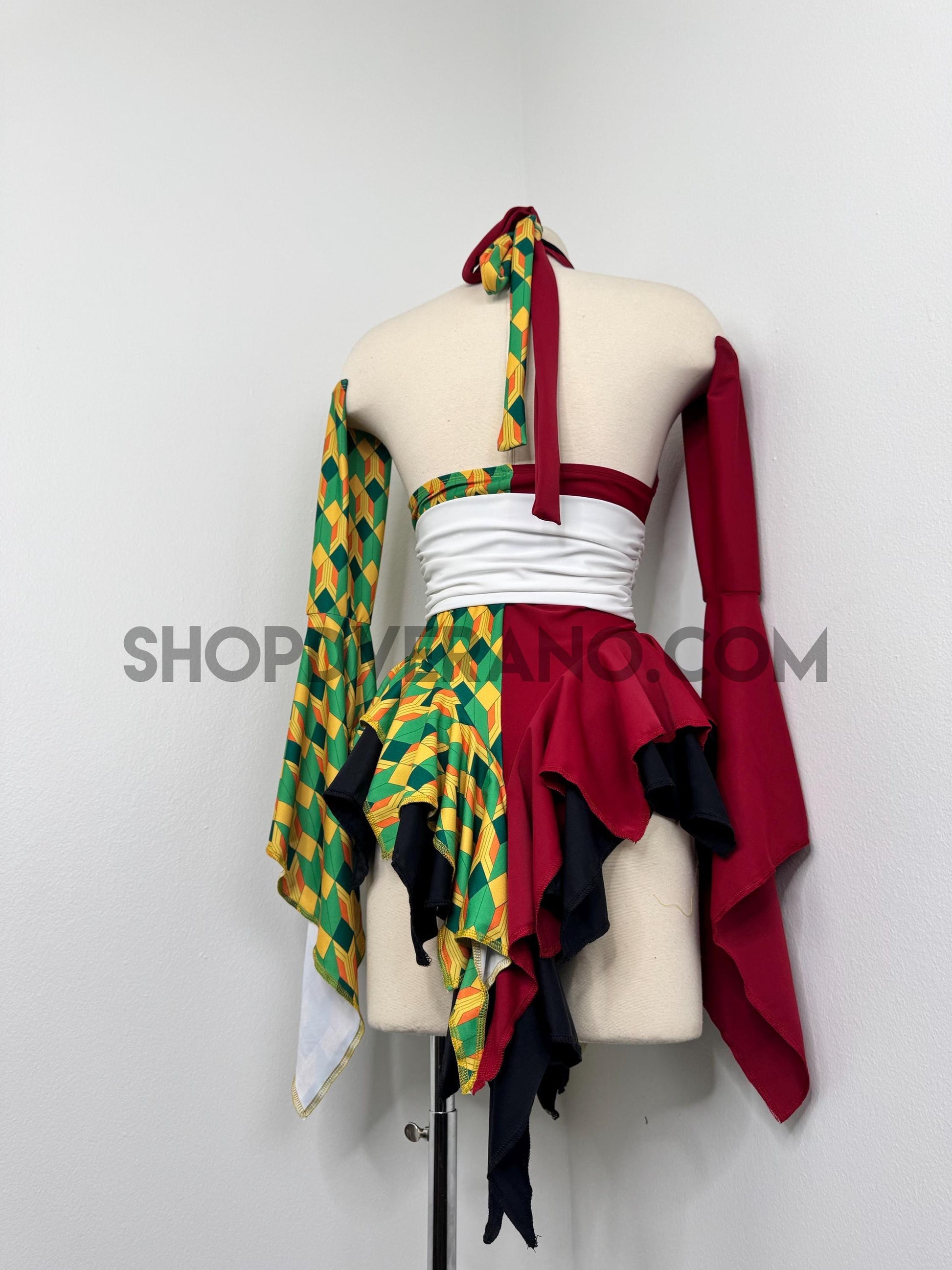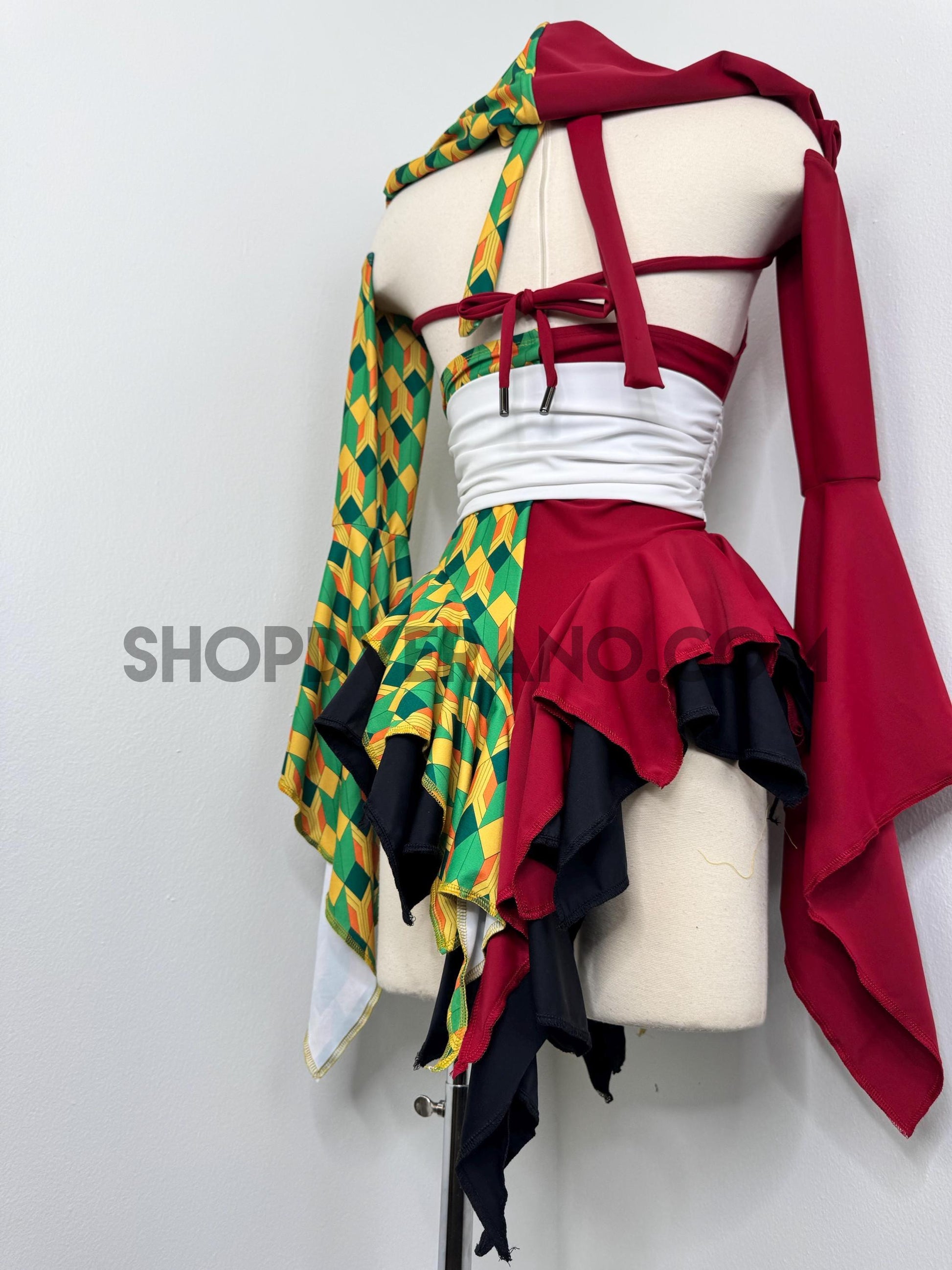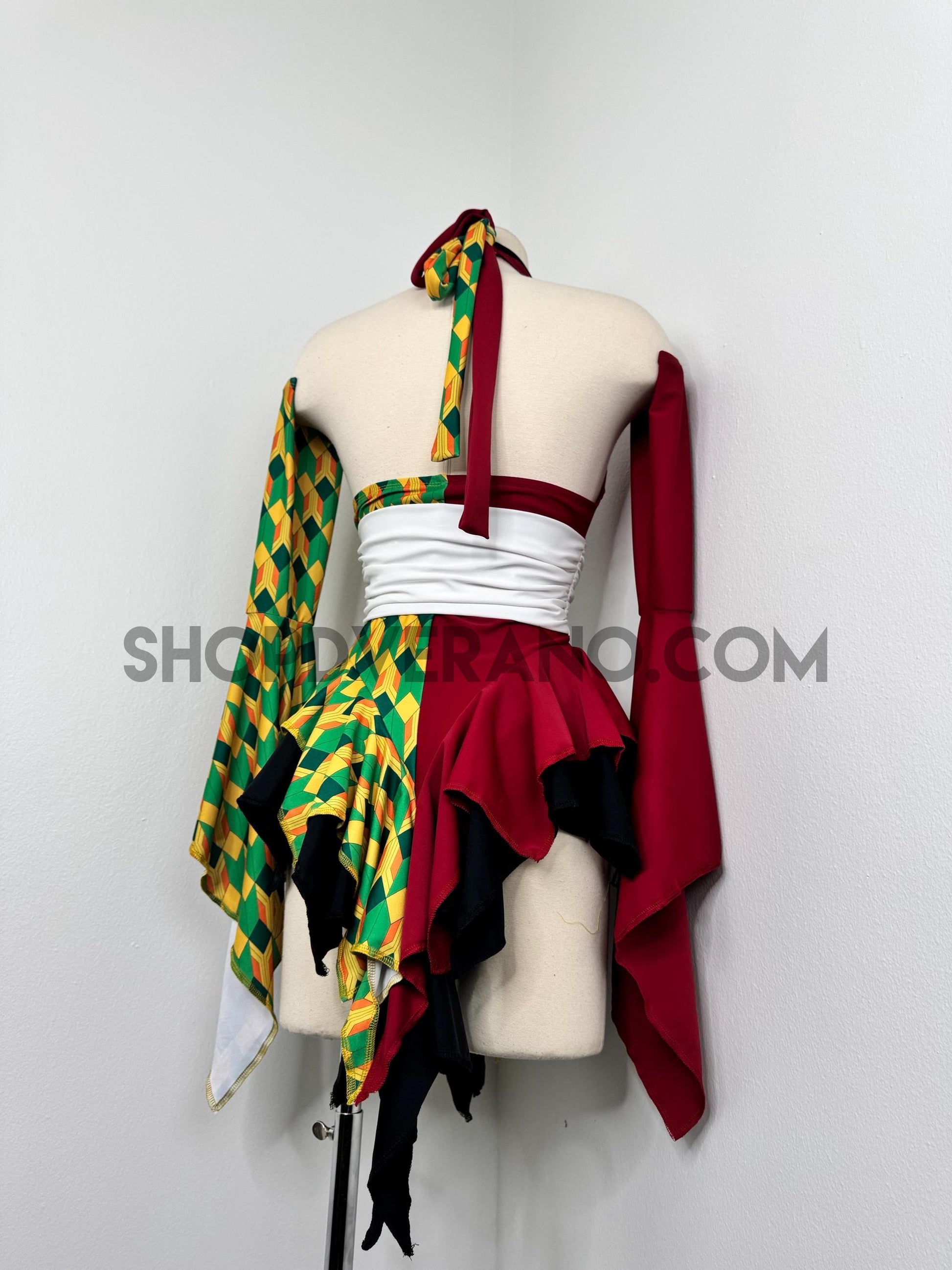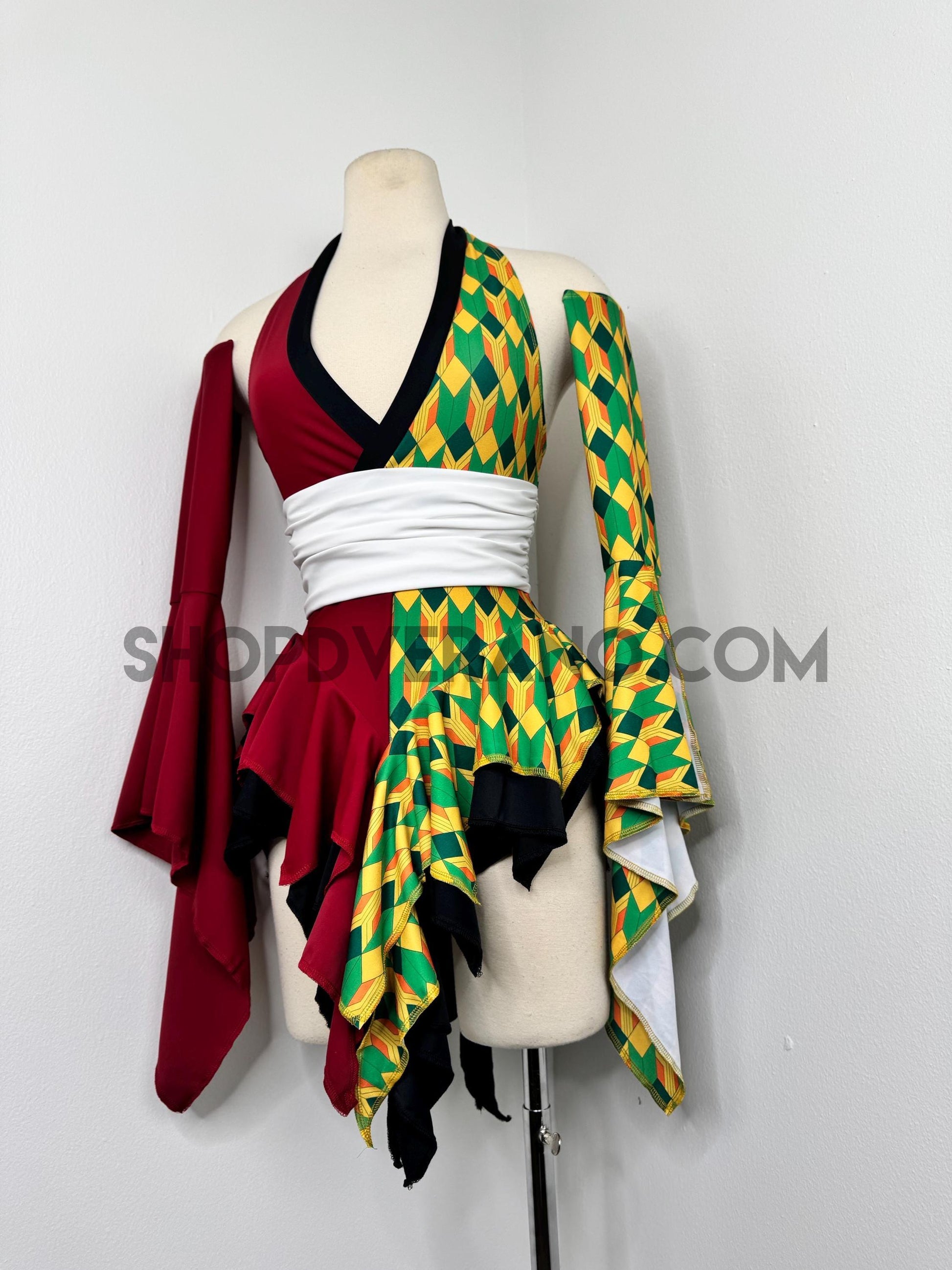 Designed with a bold asymmetrical color story, the Chilltide Fairy Set features a striking combination of half burgundy, and half emerald green & golden yellow geometric patterns, black accents, and a contrasting white waist wrap. The layered textures and contrasting panels create visual movement that reflects the balance between calm control and quiet power.