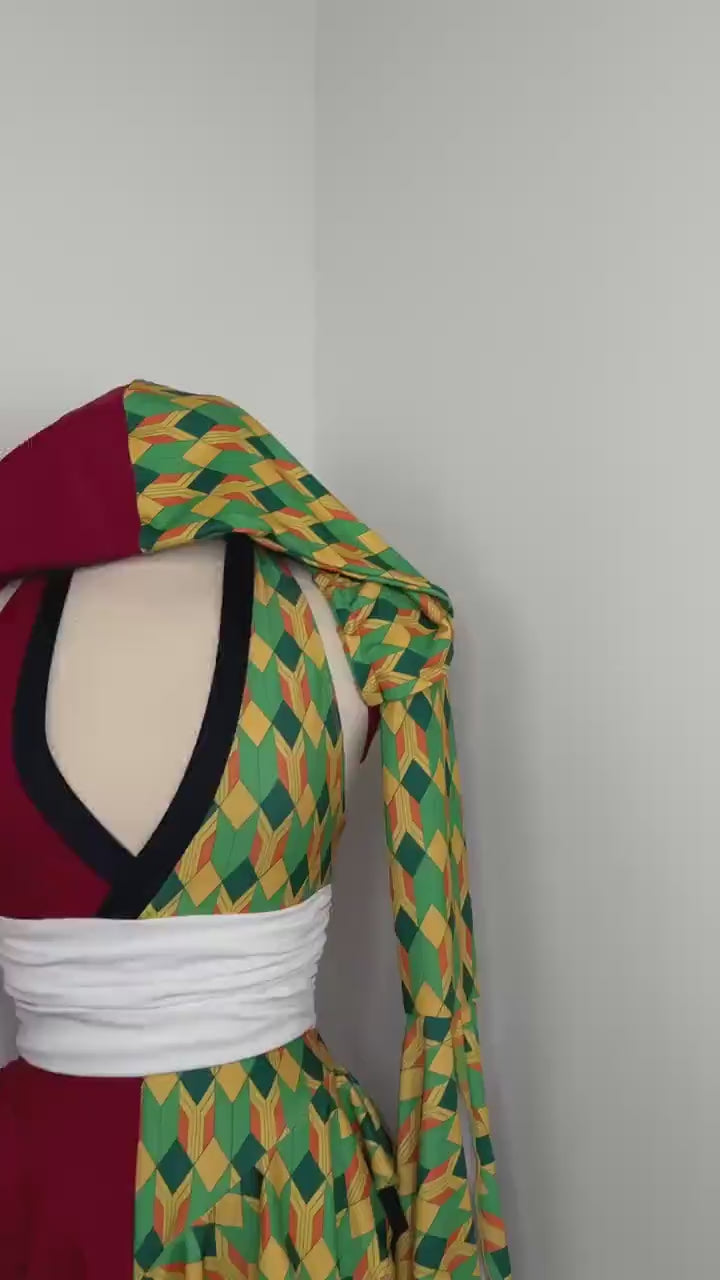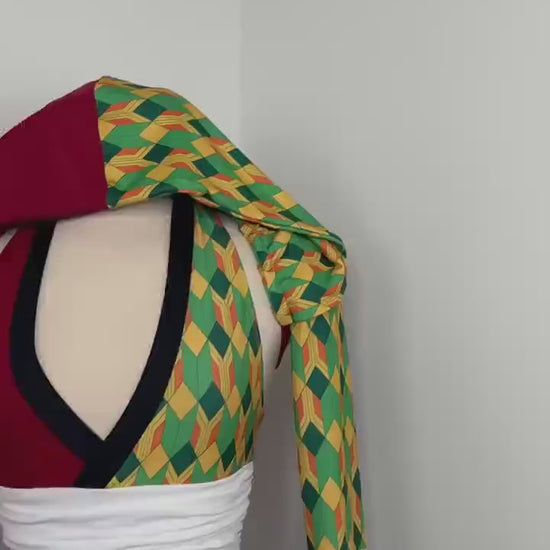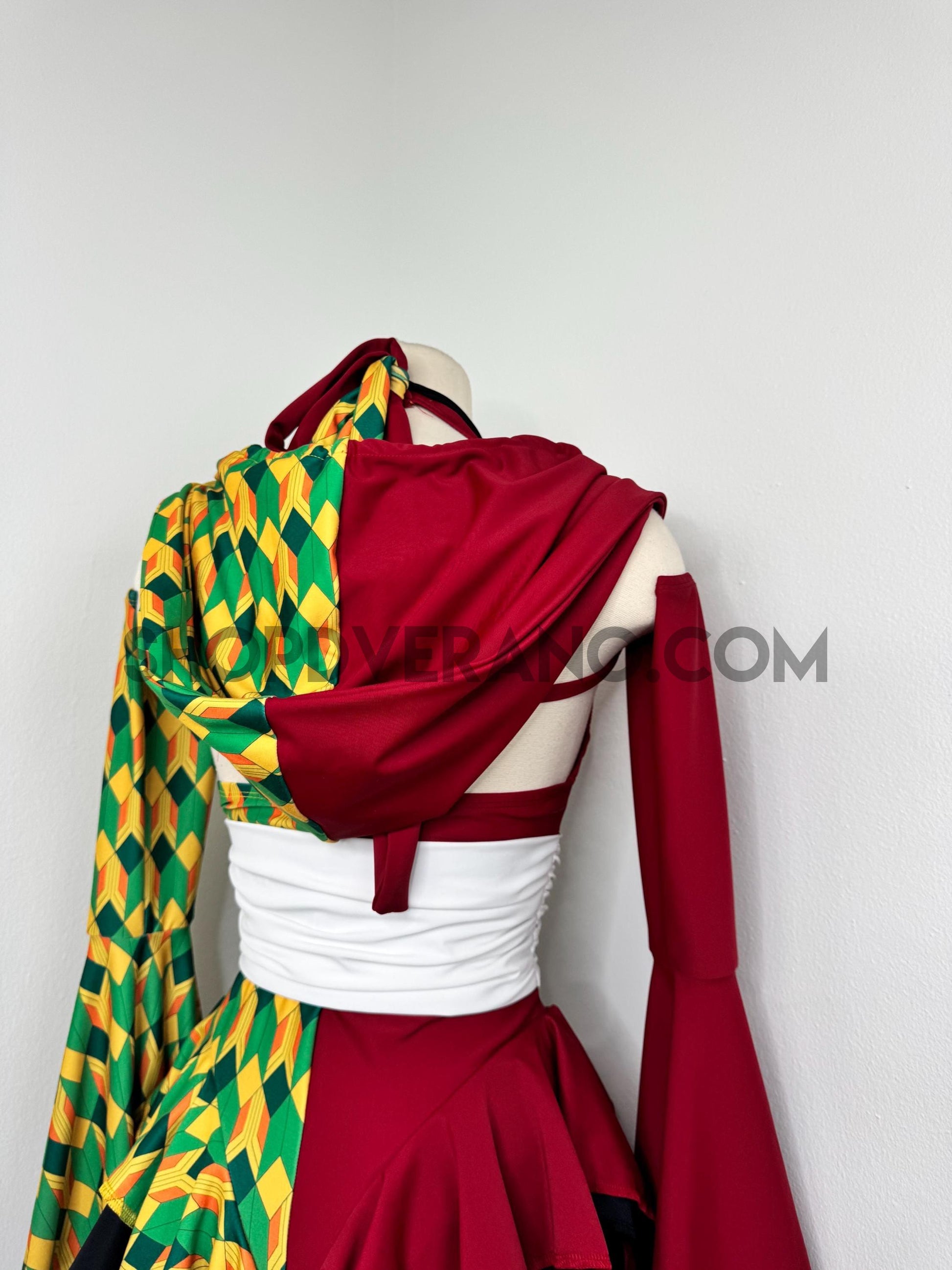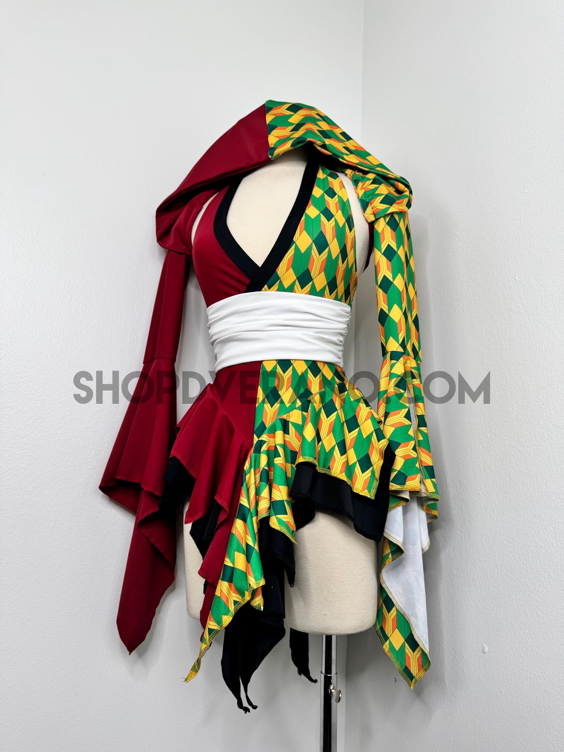 A dramatic fairy sleeve design completes the look; featuring one bold solid burgundy fairy sleeve and one with geometric print. The optional hoodie adds a mysterious, warrior inspired edge, giving the design an elevated and commanding presence.