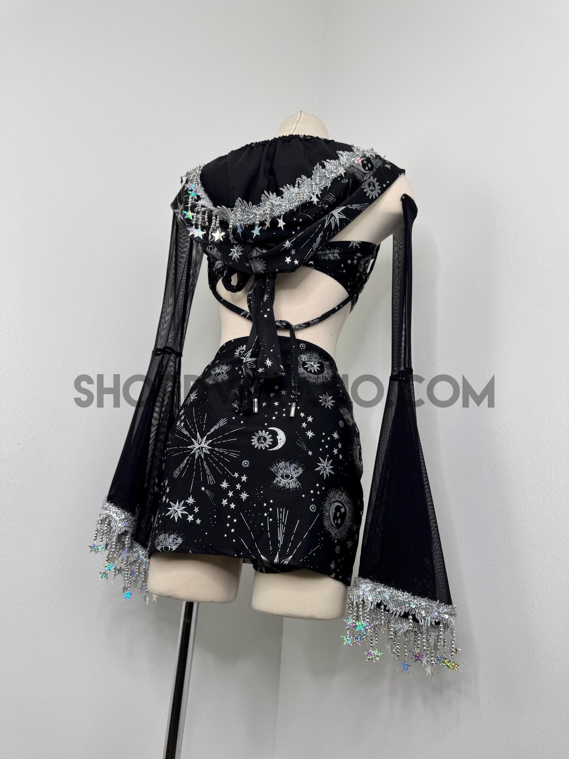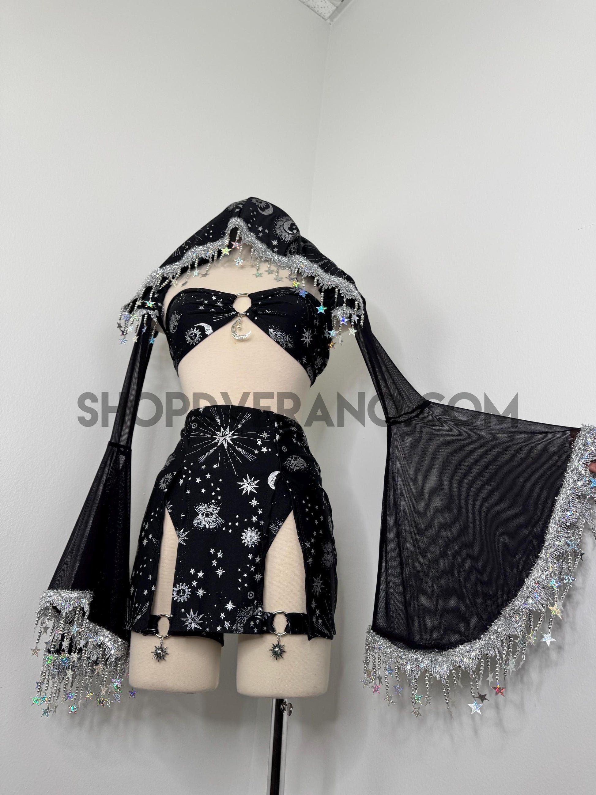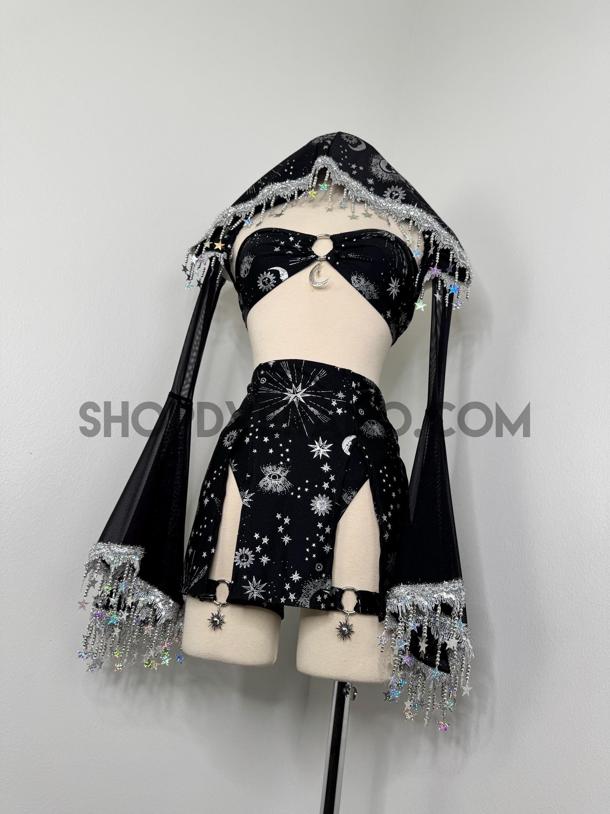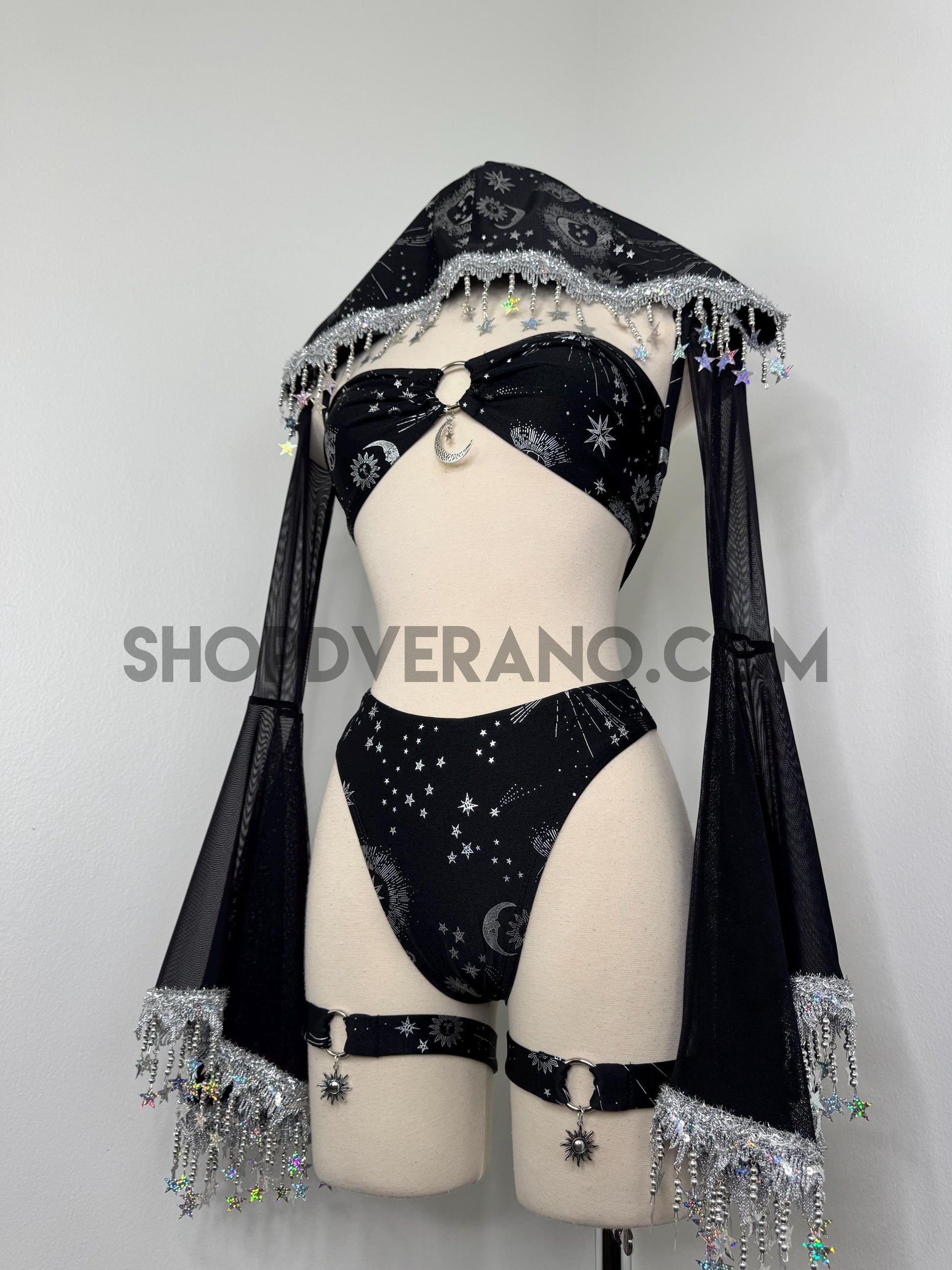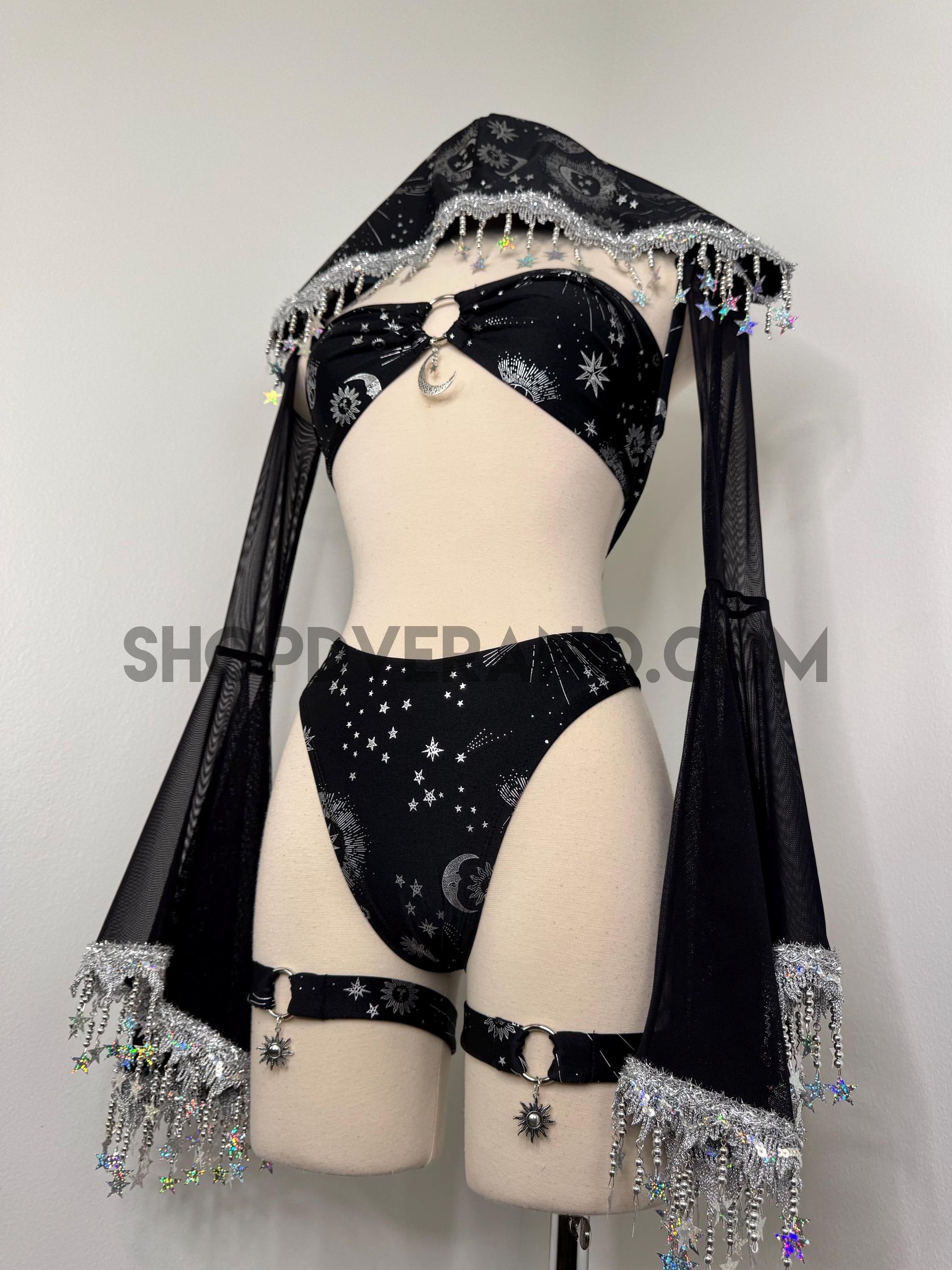 Equinox Set features a crescent moon charm at the bust, paired with silver sun charms on the leg straps for a striking contrast. The tie bandeau allows you to customize your fit, while the bikini bottoms accentuate your curves. Optional add-ons like the matching hoodie and skirt take the set to the next level for a fully styled fantasy fit.