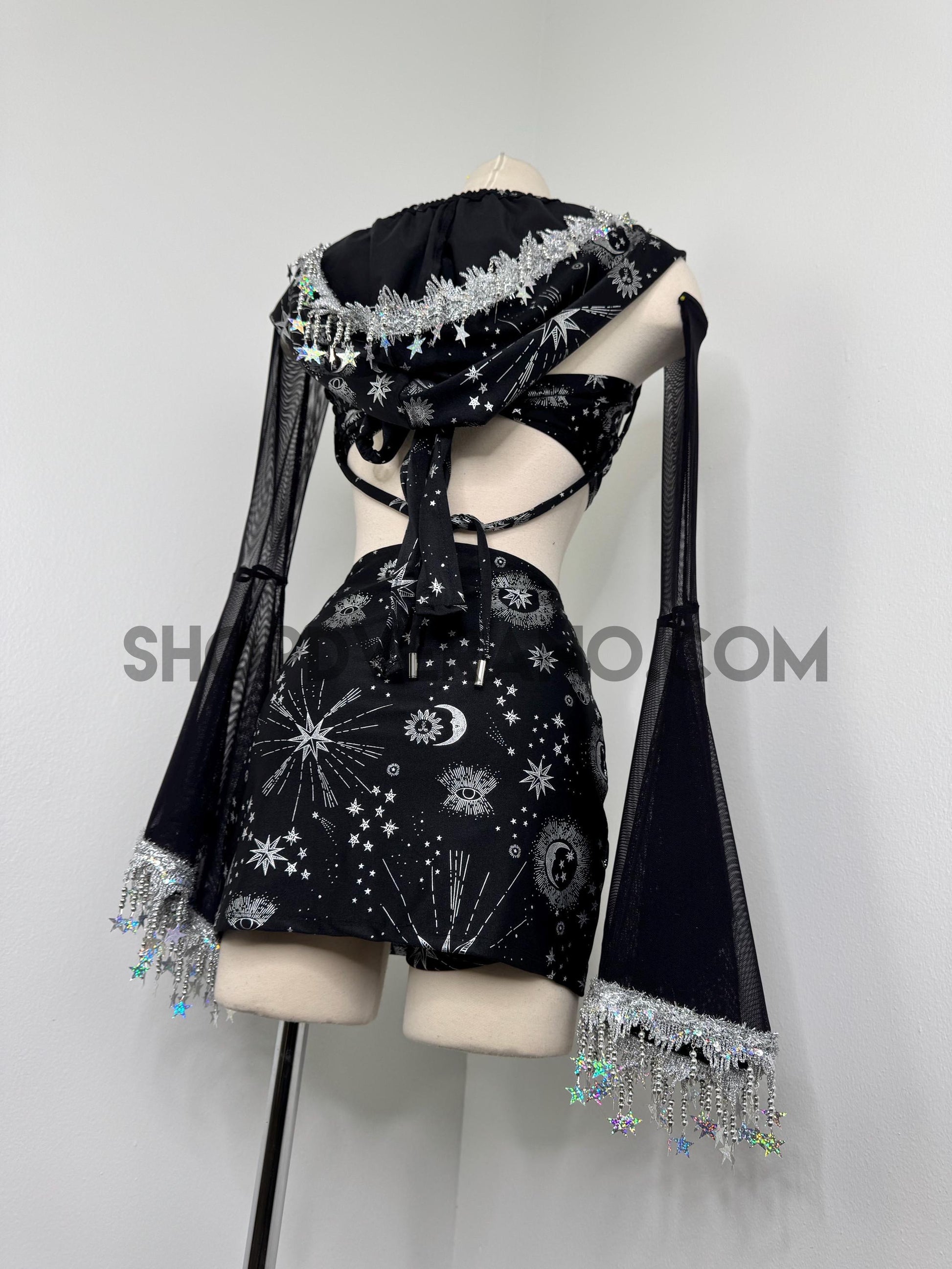 The Equinox Set is a luminous ensemble designed for those who thrive in balance ,where light meets dark and celestial energy shifts. Featuring cosmic inspired print galaxies and stars, this rave set channels moonlit magic with every step you take. Crafted to flatter and empower every body type, it’s made from high quality 4-way stretch Lycra Spandex with 230 gsm thickness, giving you a sculpted, supportive, and comfortable fit that moves with you all night long.