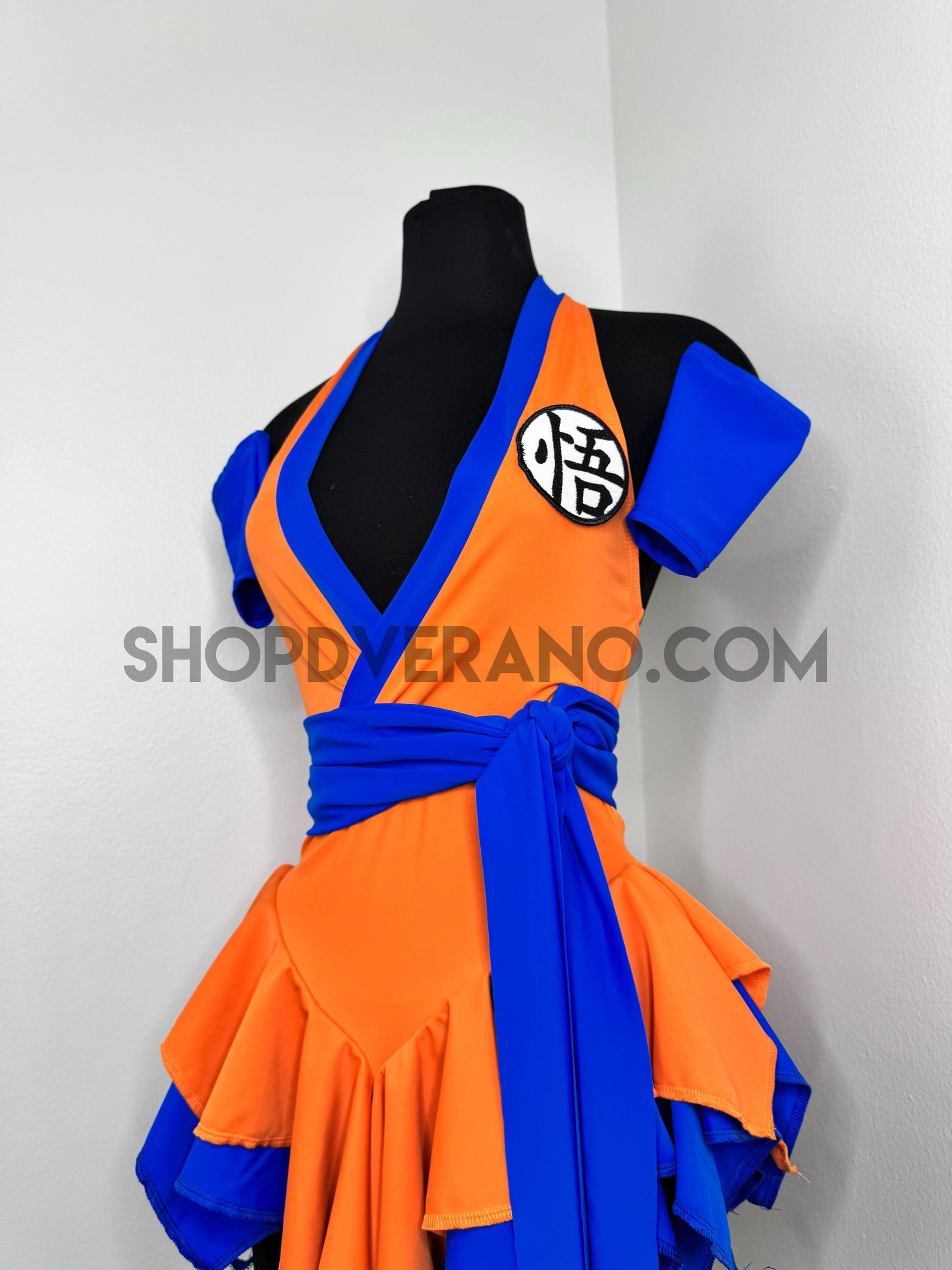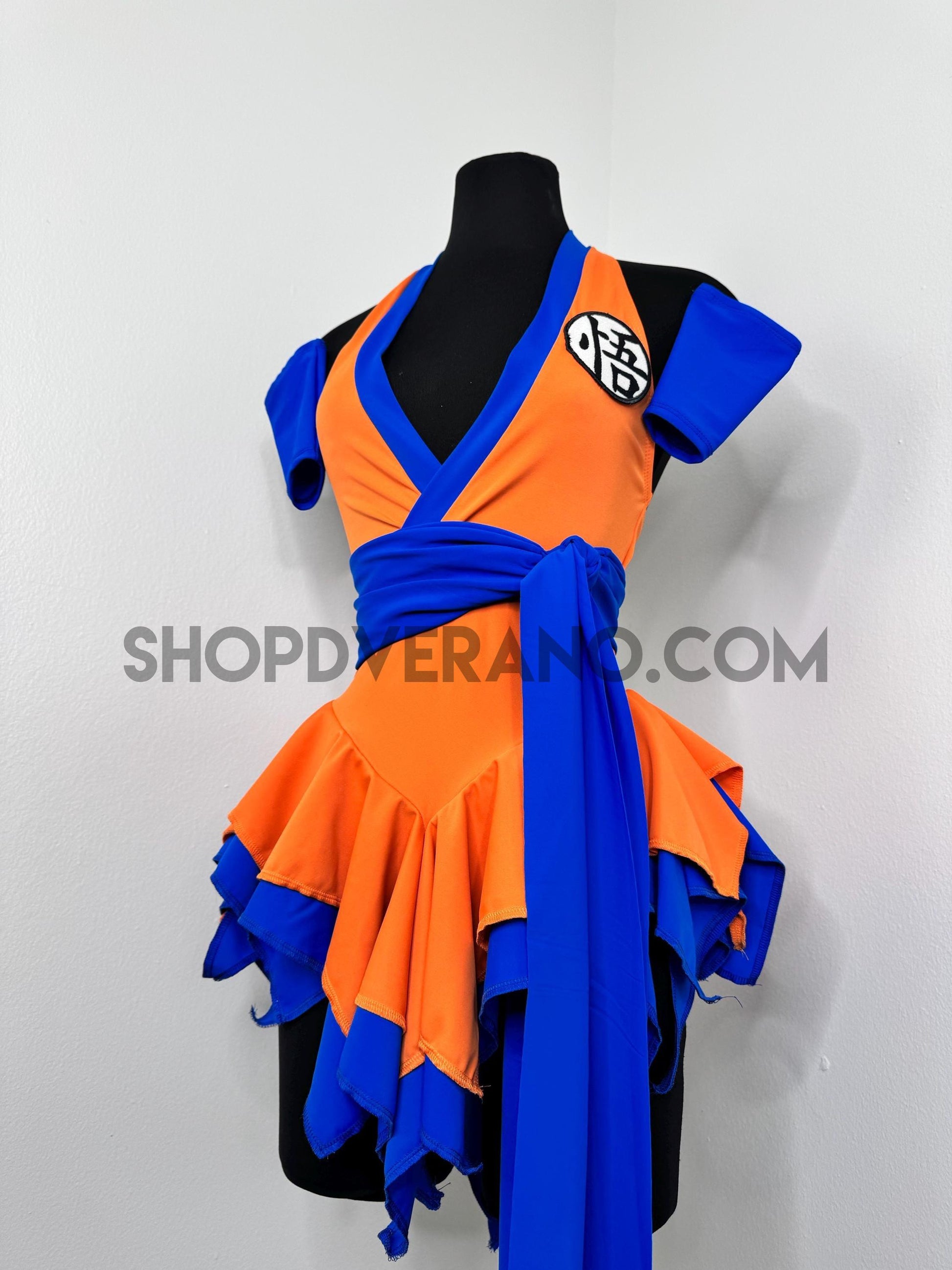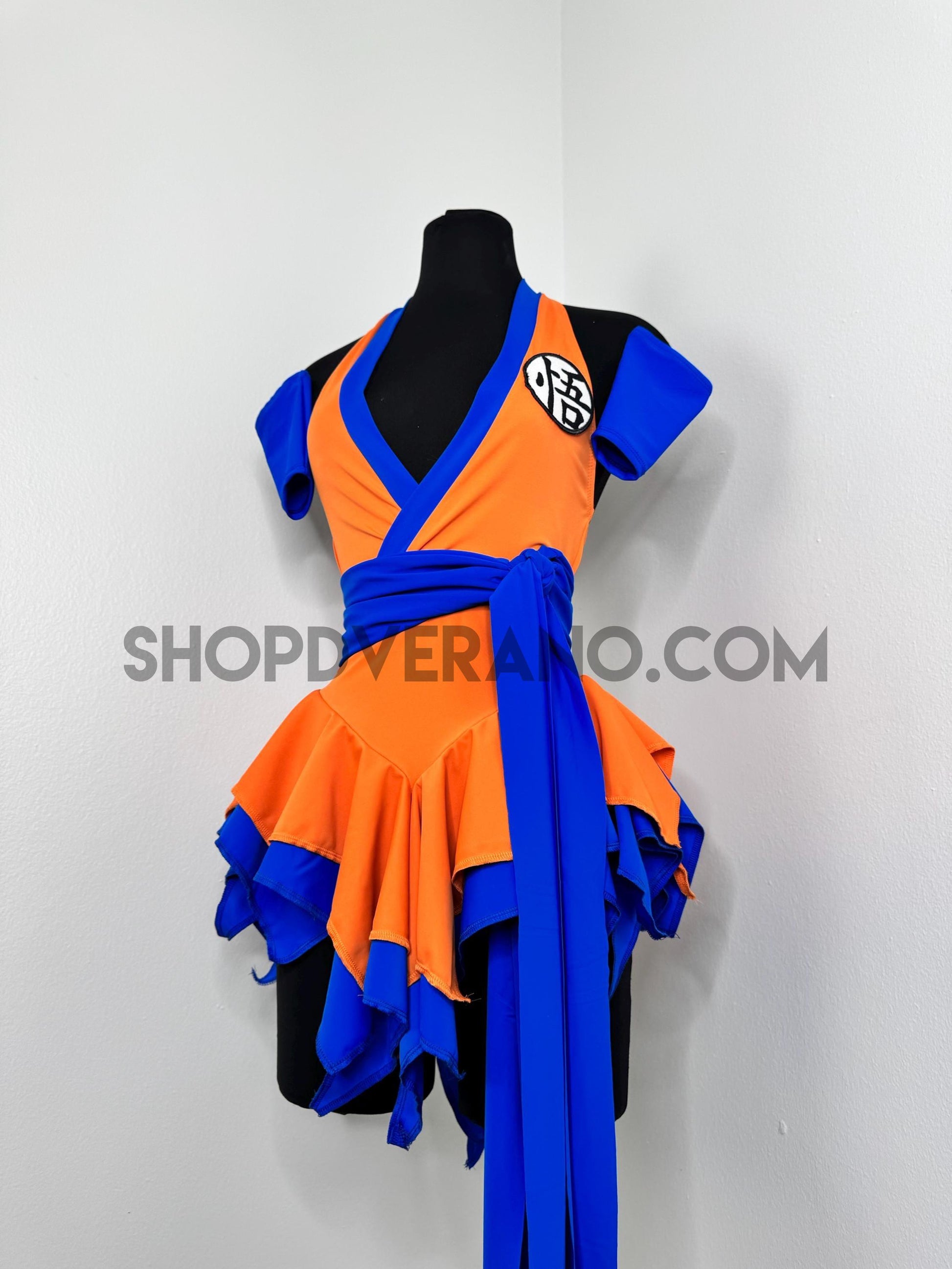 The V-cut crossed halter bodice creates a flattering, secure fit with added support from the waistband. A contrasting blue obi sash style belt detail cinches the waist and anchors the look, symbolizing focus, balance, and controlled power while enhancing the silhouette. Layered fairy panels are designed to elongate and accentuate the body, creating a naturally sculpted effect at the waist. As you move, the skirt panels flutter with intention, mirroring the flow of energy in motion.