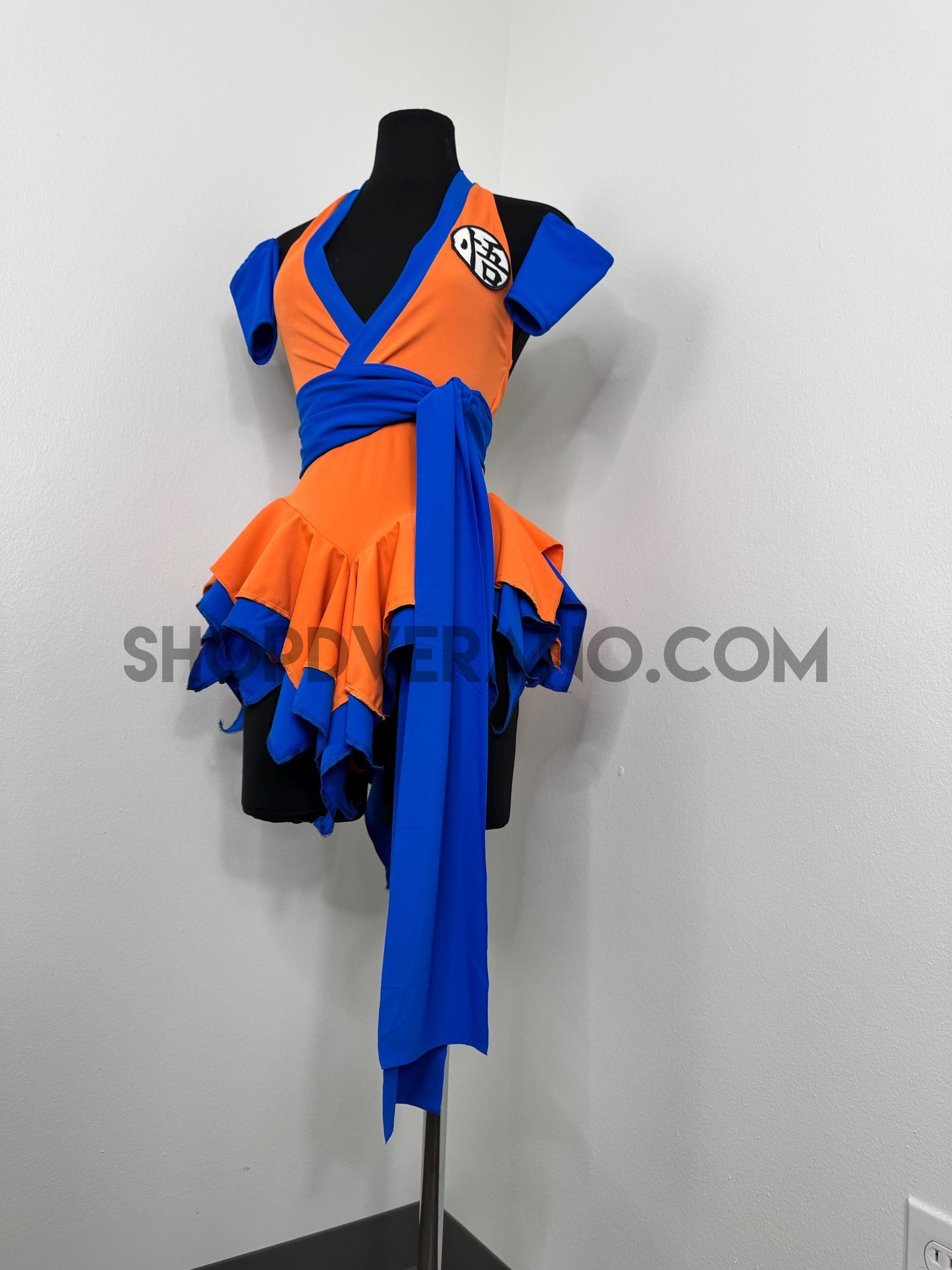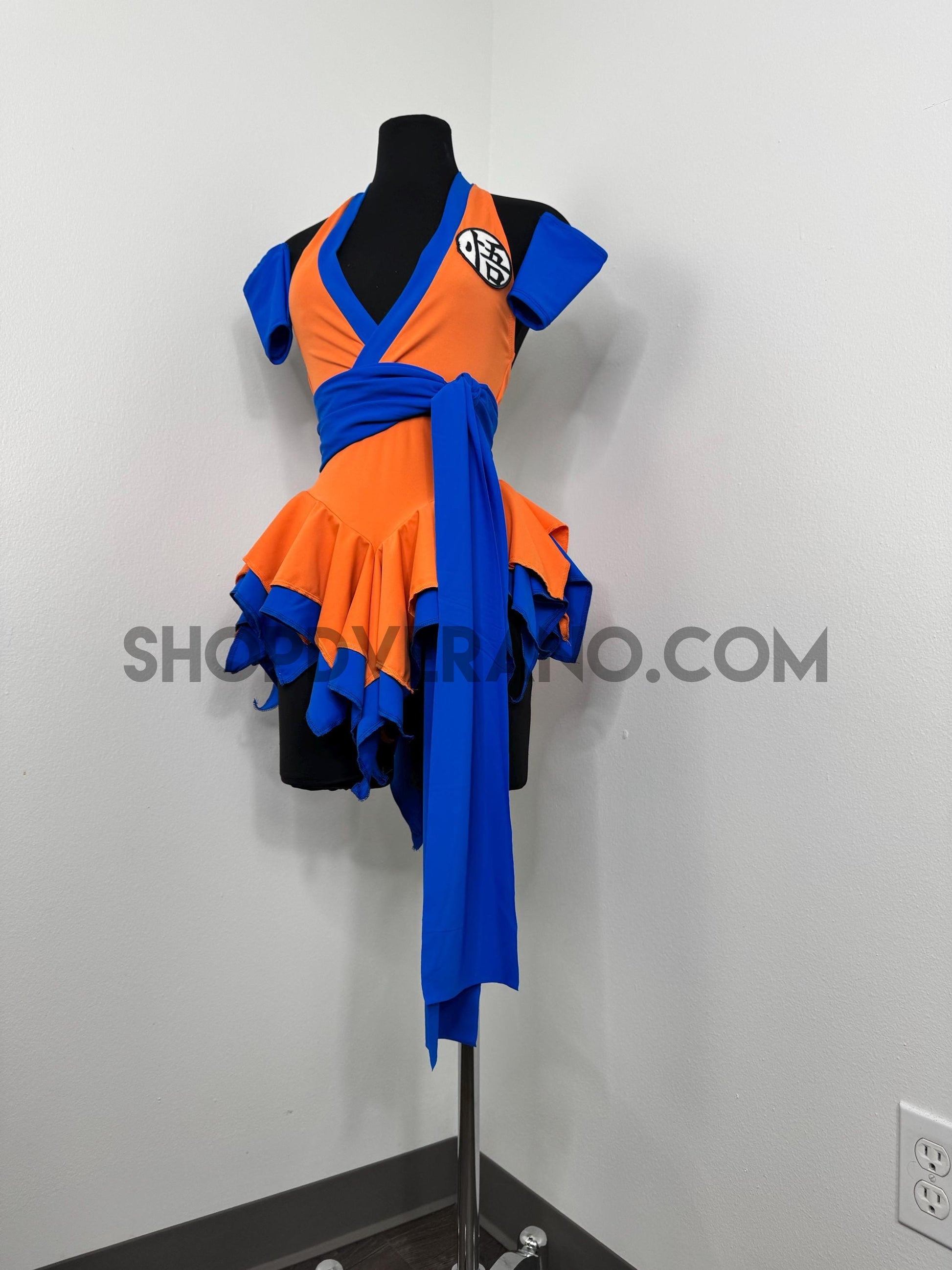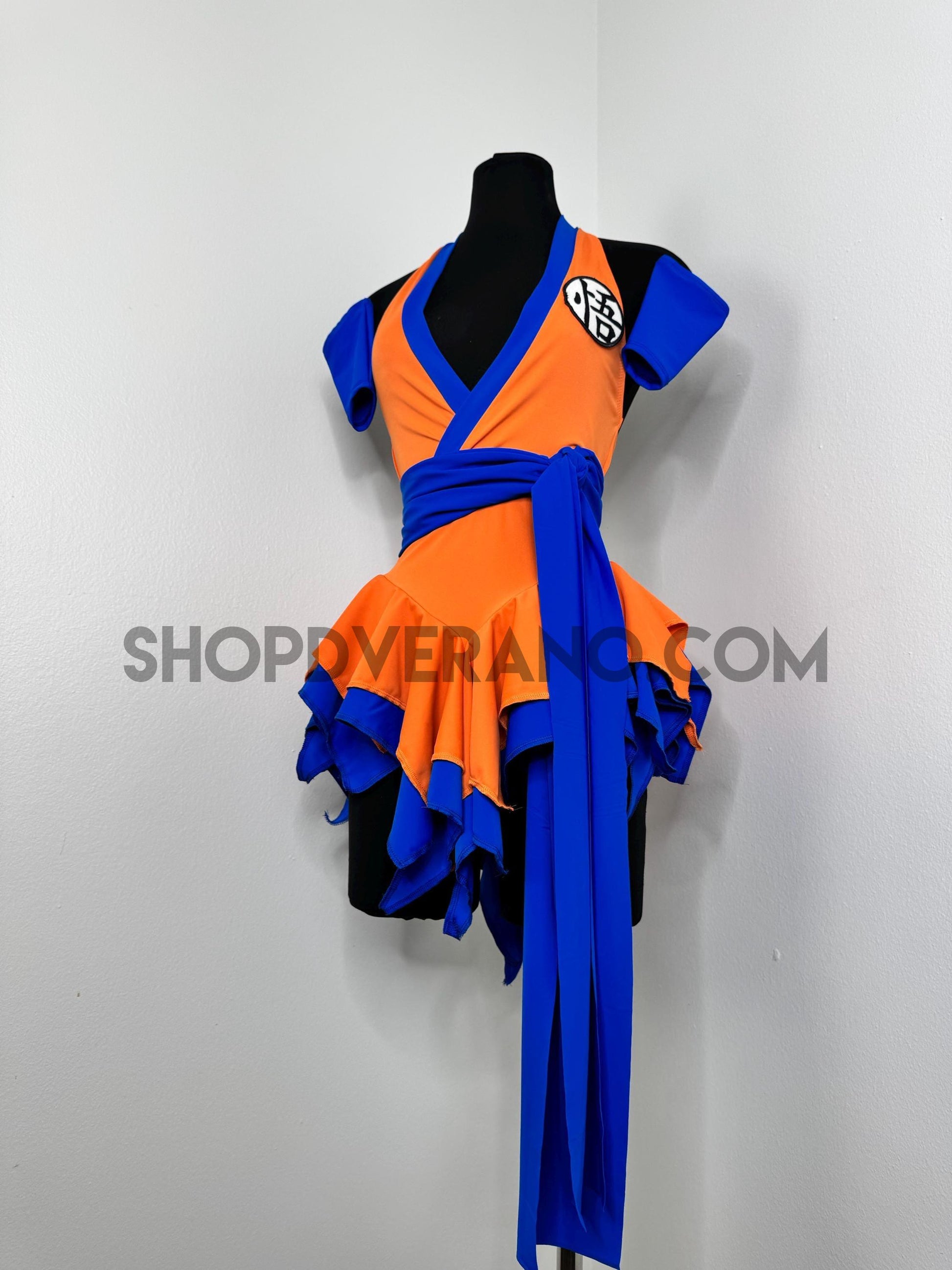 The V-cut crossed halter bodice creates a flattering, secure fit with added support from the waistband. A contrasting blue obi sash style belt detail cinches the waist and anchors the look, symbolizing focus, balance, and controlled power while enhancing the silhouette. Layered fairy panels are designed to elongate and accentuate the body, creating a naturally sculpted effect at the waist. As you move, the skirt panels flutter with intention, mirroring the flow of energy in motion.