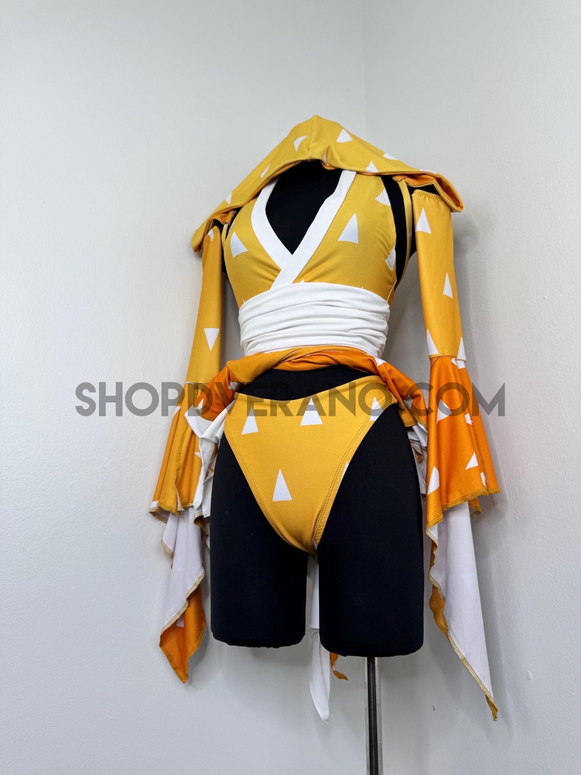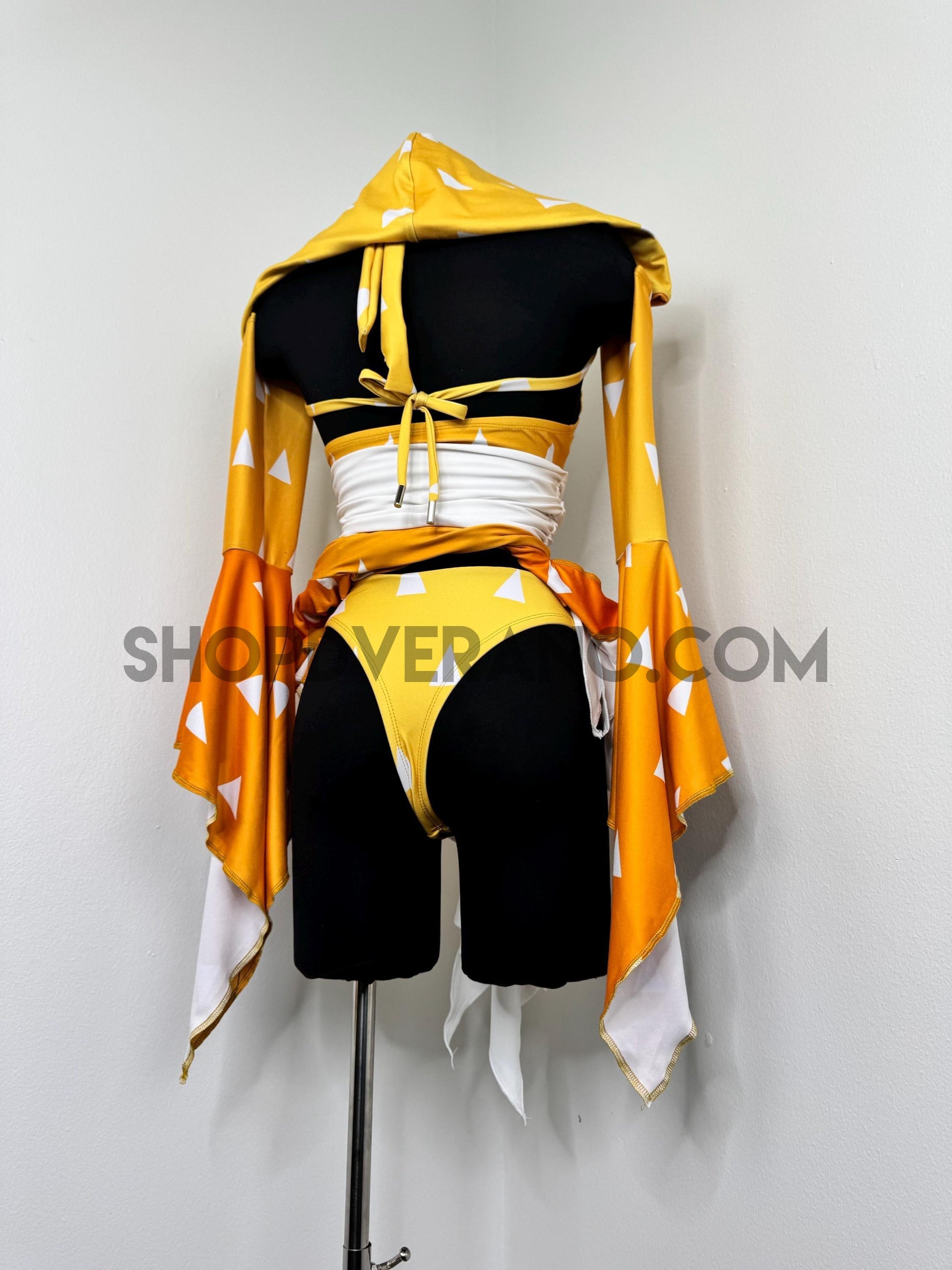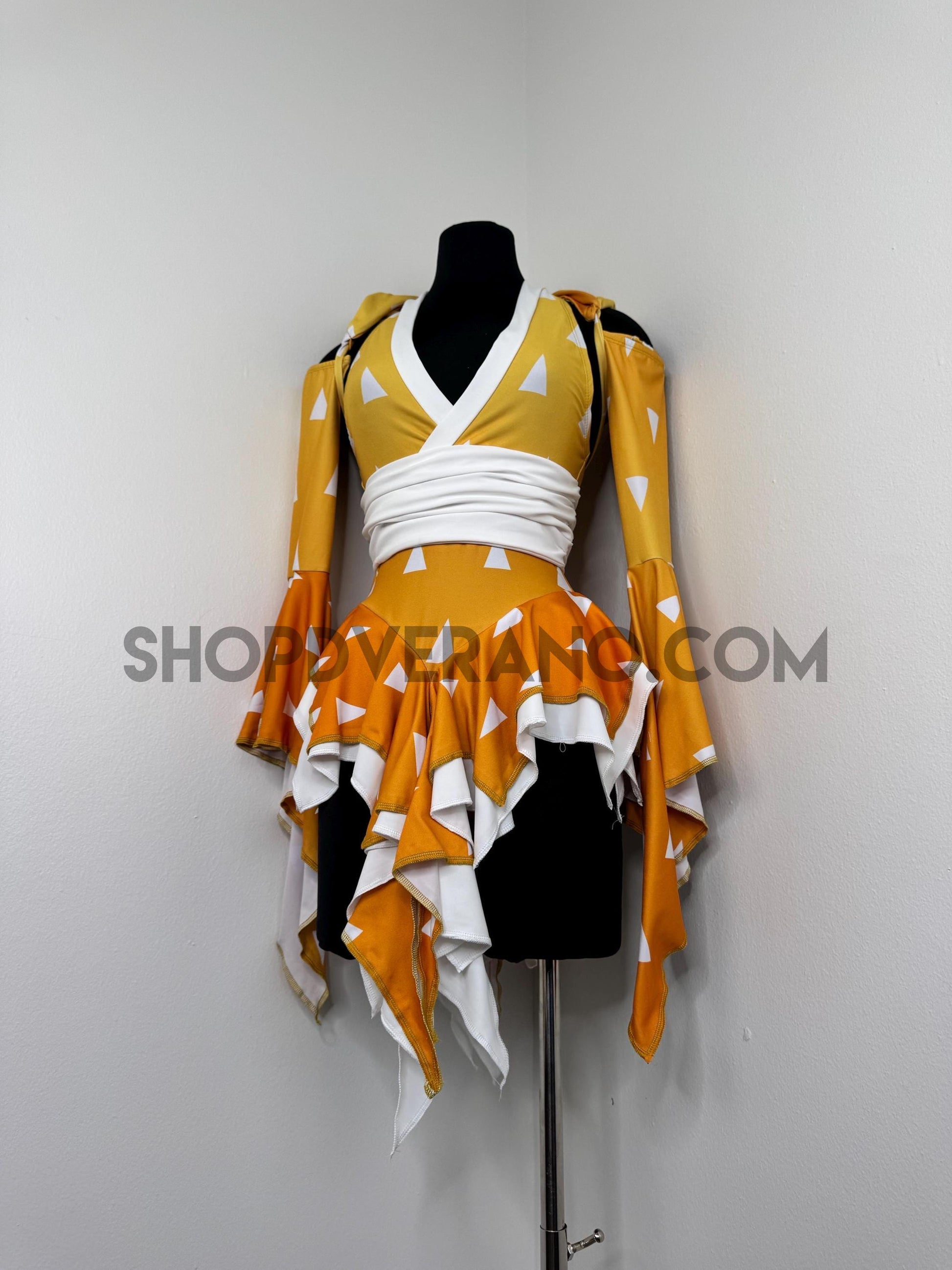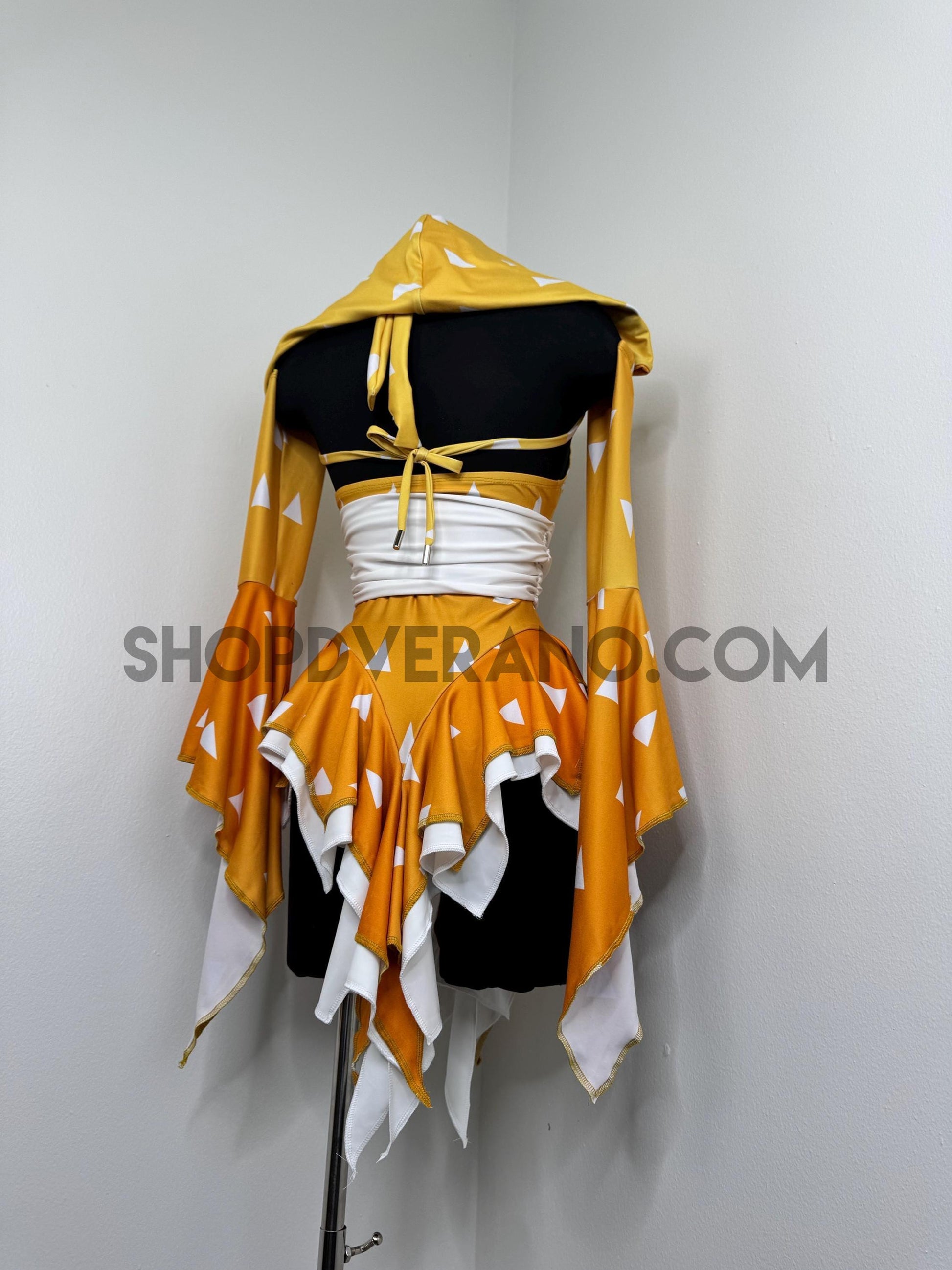 Designed in a golden orange yellow ombré gradient with contrasting white paneling, the Slumbering Thunder Fairy Set reflects the energy of lightning. Crafted from high quality 4-way stretch fabric, the set accentuates your curves while remaining breathable and comfortable for long nights of anime conventions, and festivals.