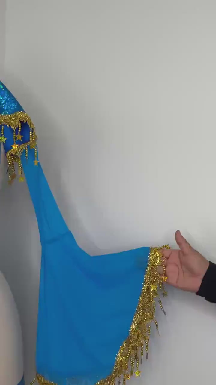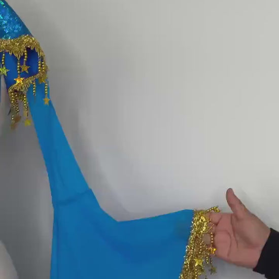 The look is elevated with a matching hooded bolero featuring star trim, adding celestial drama and movement, while flowing sleeves create an ethereal, siren-inspired silhouette. Elastic legs straps finish the look with a bold, statement touch that ties the entire set together.